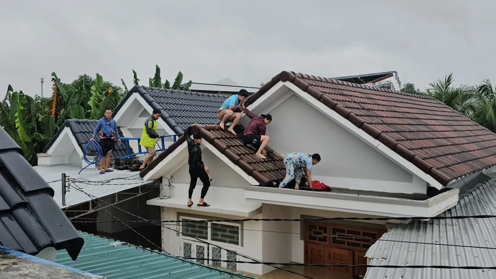 Người dân phá mái ngói để cứu hàng xóm. Ảnh: XUÂN HOÁT