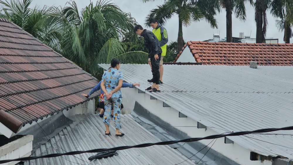 Lúc này, nhiều người nhà có lầu đã đập cửa sổ để leo lên mái nhà cứu hàng xóm.
