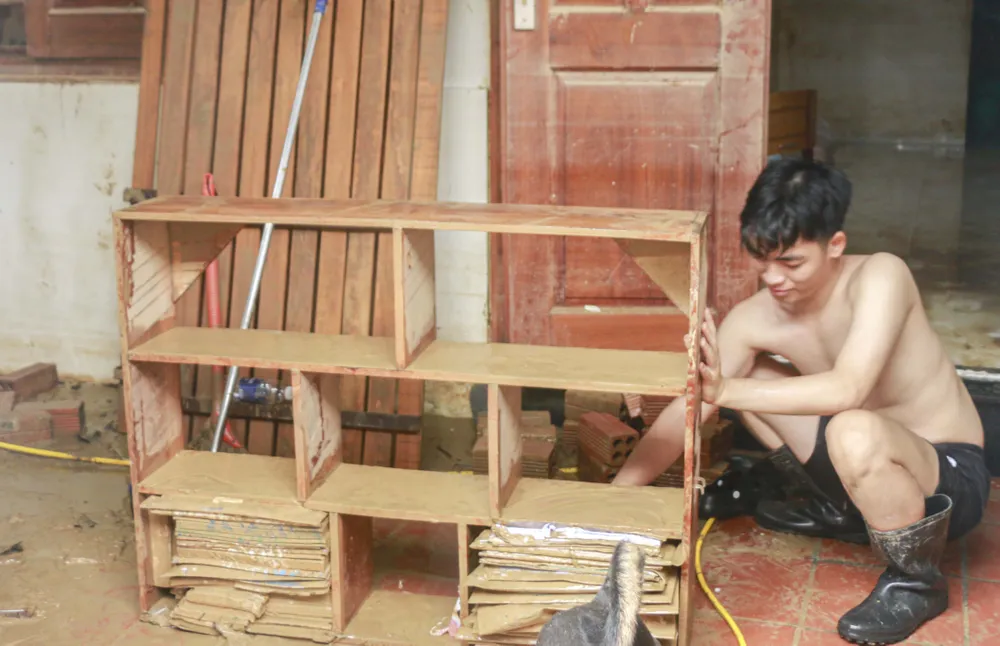 "Cố gắng nhặt nhạnh những thứ còn dùng được để hết mưa lũ còn dùng. Gắng gượng để cuộc sống sớm ổn định, các con còn đến trường" - anh Khoa (áo xanh) cho biết.