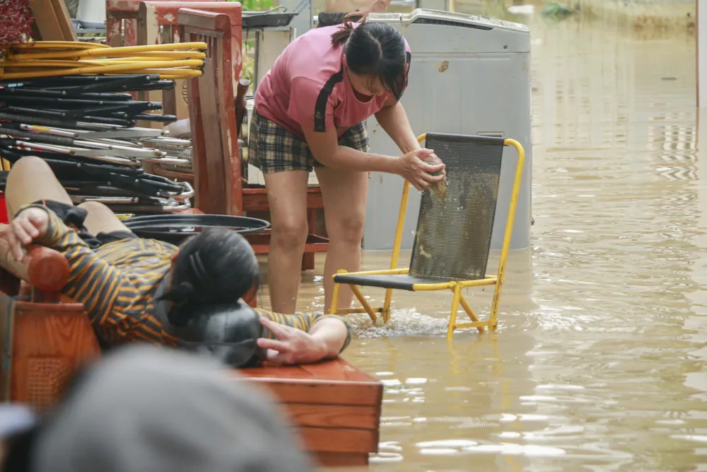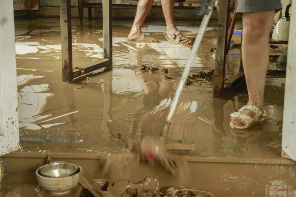 Nước máy rất yếu, người dân tận dụng nước lụt còn chưa rút hết để chùi rửa đồ đạc dính đầy bùn đất.