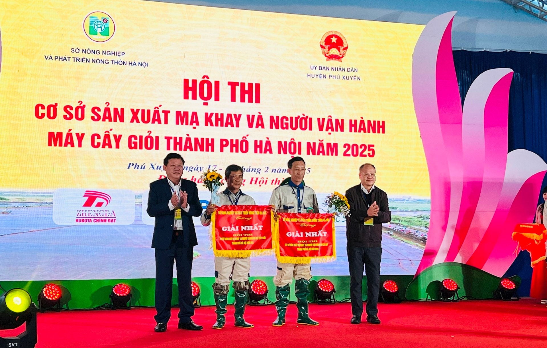 Ông Phạm Văn Vĩnh cùng thợ lái máy của mình tham gia hội thi cấy năm 2025 tại huyện Phú Xuyên (cũ). Ảnh: PV