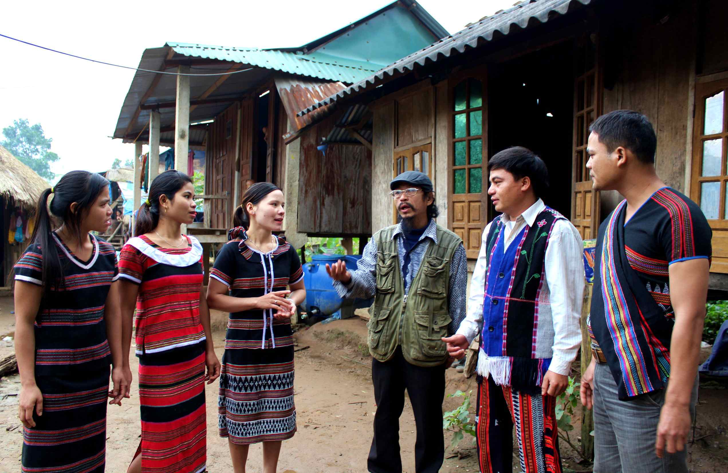 Nghệ nhân Kray Sức (đứng thứ 3, từ phải sang trái) truyền tình yêu, niềm tự hào về phong tục, tập quán tốt đẹp của người Pa Kô cho các bạn trẻ - Ảnh: Q.H