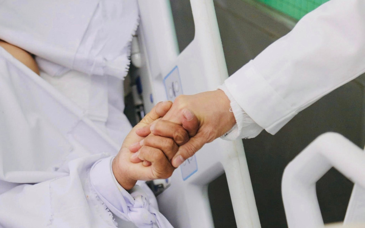 Tay chị B nắm chặt tay bác sĩ như muốn nói lời tri ân sâu sắc đến đội ngũ nhân viên y tế 2 bệnh viện - Ảnh BVCC