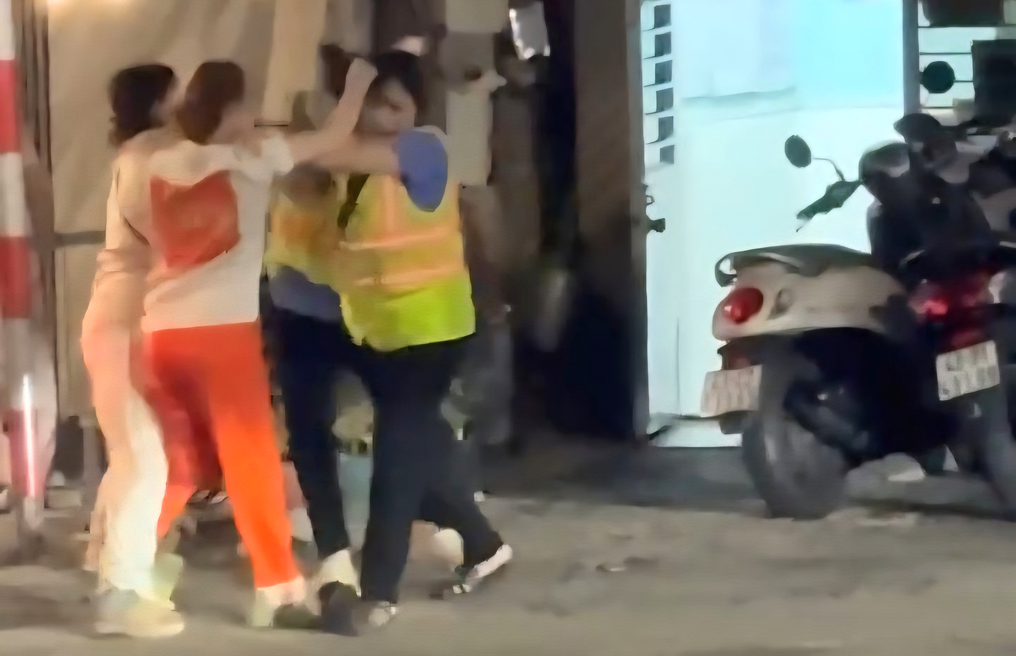 Tiếp đó, người phụ nữ này và đồng bọn đã lao vào tấn công các nhân viên gác chắn. Đỉnh điểm sự tấn công của những người này khiến một nhân viên gác chắn ngã xuống đất.