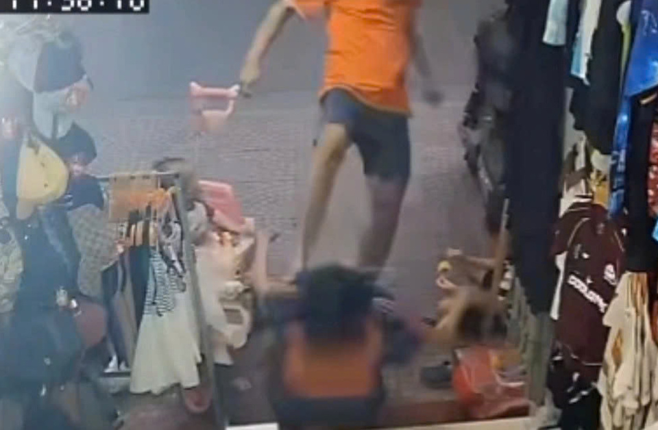 Gã đàn ông mặc áo cam đá vào mặt người phụ nữ đang trông 2 con nhỏ.