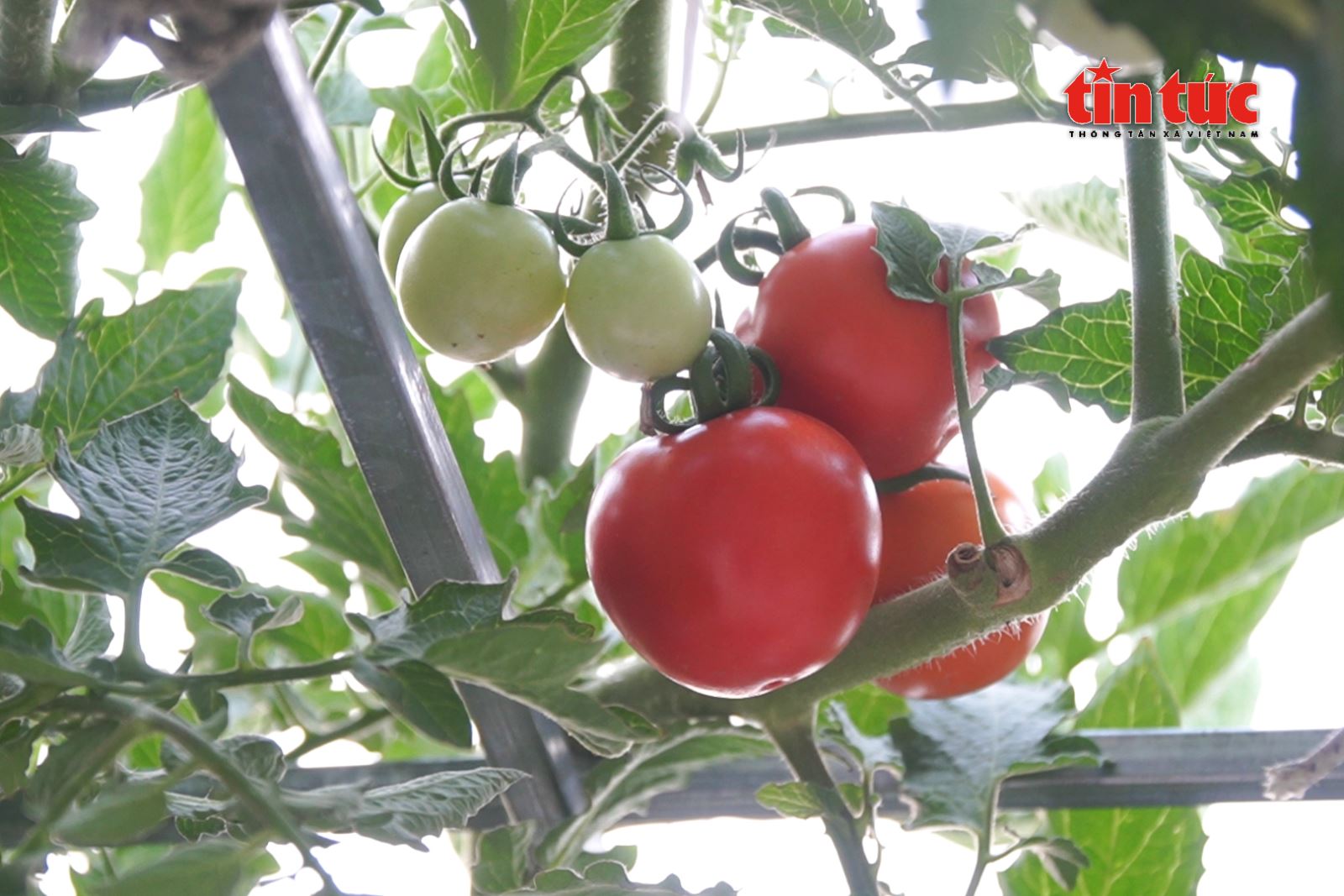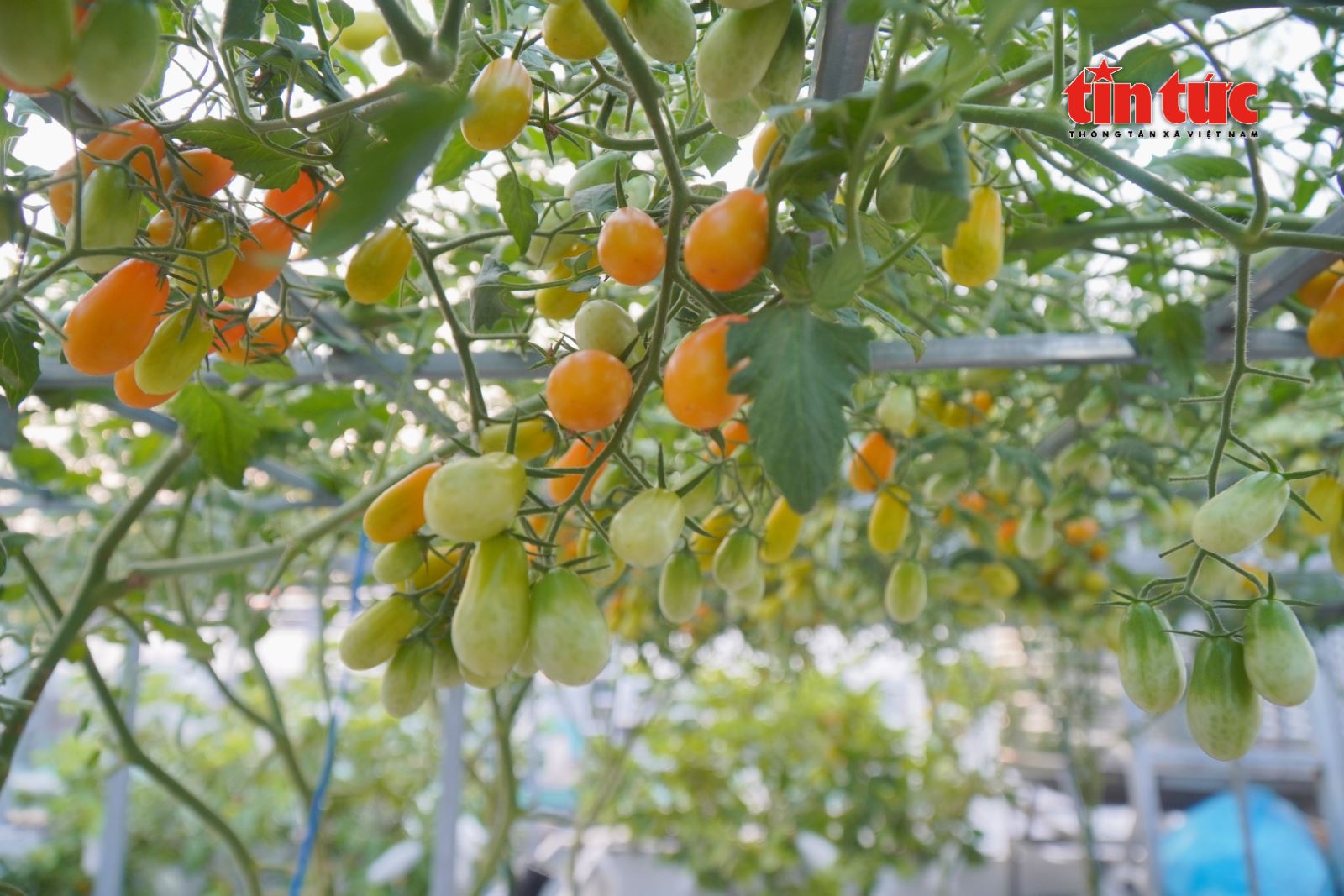 Vào những tháng nắng, khu vườn của chị nổi bật với hai giàn cà chua lớn, gồm cà chua bạch tuộc và cà chua Canary. Bên cạnh đó là các luống súp lơ, bắp cải, dâu tây và nhiều loại rau theo mùa.