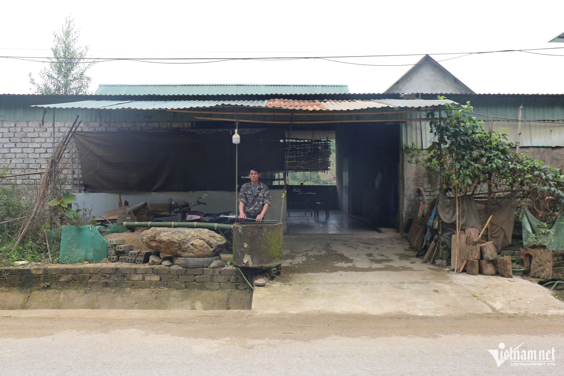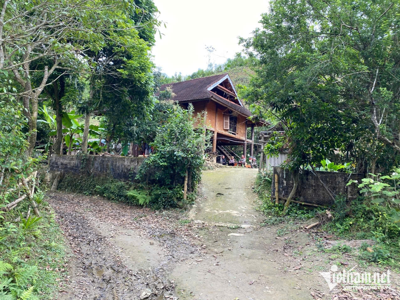 Con đường dẫn vào ngôi nhà cũ ở cụm dân cư Háng Na vẫn lổn nhổn ổ gà, phải vượt qua con suối nhỏ mới đến được nhà.