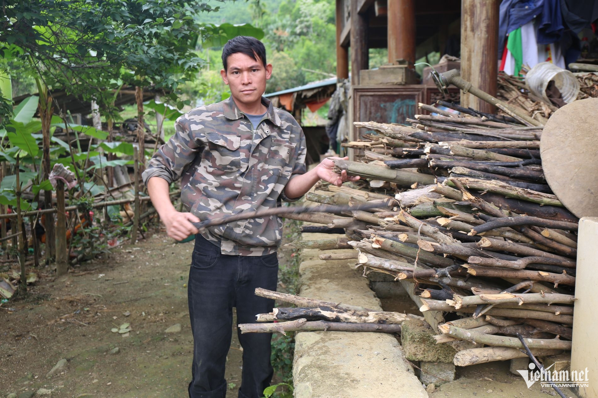 Mỗi ngày, người đàn ông hơn 30 tuổi phải đi lại giữa hai nơi, vừa chăm sóc vợ con, vừa lo thăm nom cha mẹ và bà nội già yếu ở căn nhà sàn cũ dưới chân núi.
