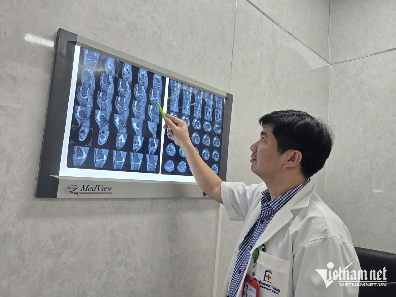 TS. BS Ma Ngọc Thành kiểm tra phim cho bệnh nhân chấn thương do chơi thể thao. Ảnh: N. Huyền