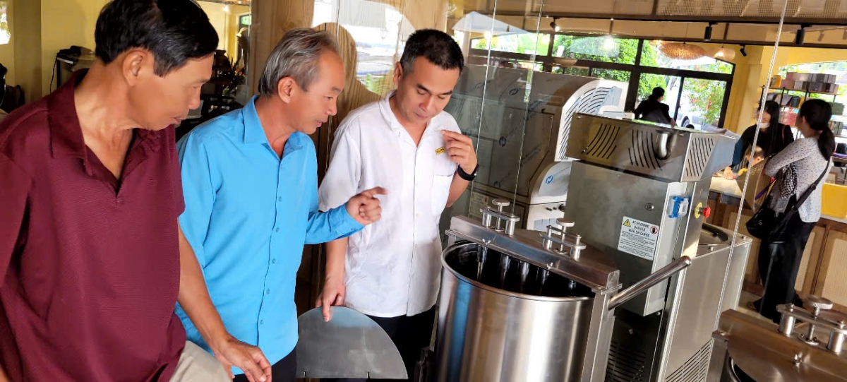 Hệ thống thiết bị, máy móc trong quy trình sản xuất hạt ca cao thành các sản phẩm sôcôla tại công ty của chị Nguyễn Ngọc Điệp
