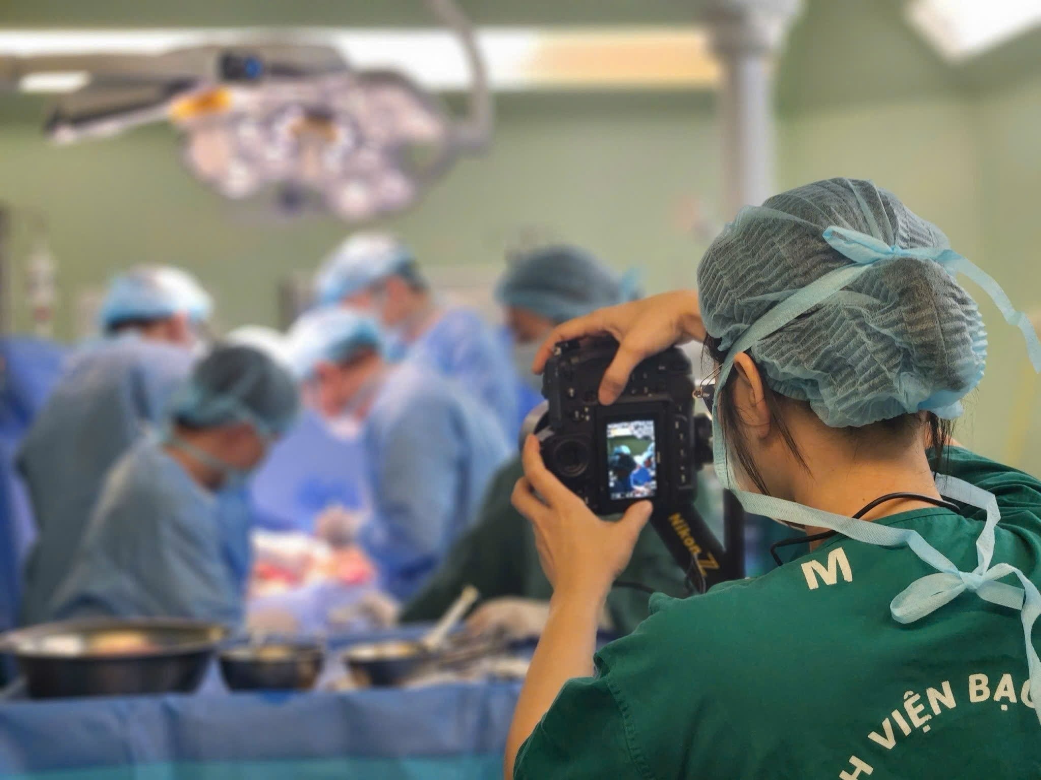 Giữa không gian đặc quánh mùi thuốc sát trùng, ánh đèn mổ rọi thẳng xuống bàn phẫu thuật, mọi chuyển động đều được tính bằng giây. Ở đó, những con người mặc áo blouse, đội mũ, đeo khẩu trang kín mít gần như xóa nhòa danh tính, chỉ còn lại ánh mắt và đôi bàn tay làm việc chính xác đến từng chi tiết. Trong khung cảnh ấy, chị Nguyễn Thị Phương Hồng lặng lẽ đứng phía ngoài vòng vô khuẩn, nâng máy ảnh, bấm máy.