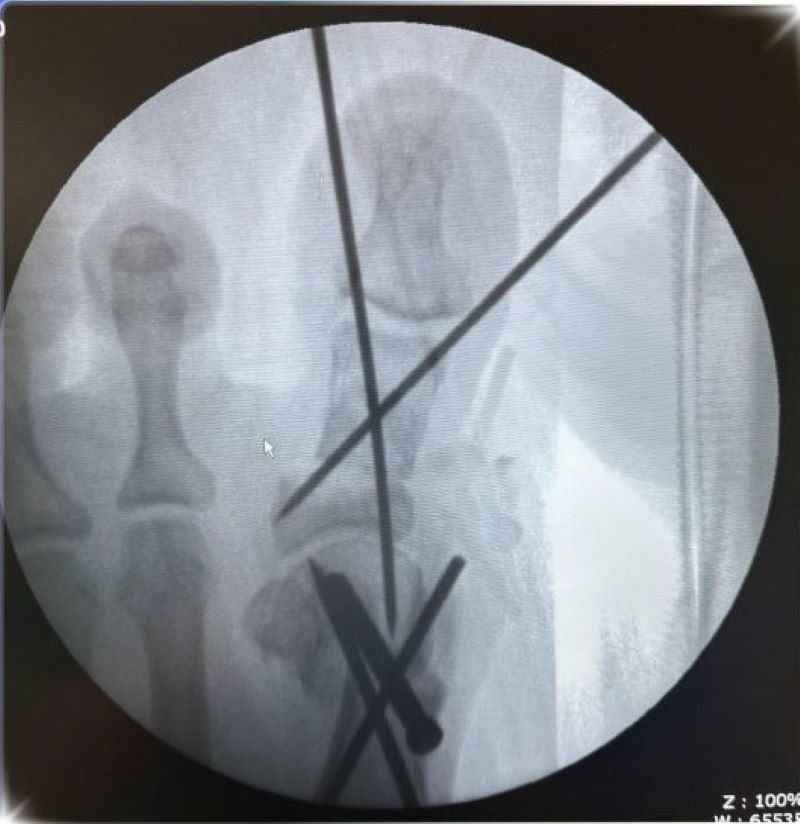 Ca phẫu thuật được tiến hành dưới sự hỗ trợ của hệ thống C-arm, thiết bị chẩn đoán hình ảnh trong mổ, giúp bác sĩ xác định chính xác vị trí cần can thiệp. Quá trình bao gồm: cắt xương, nắn chỉnh trục ngón cái, cố định bằng đinh và vít, sau đó khâu đóng và băng ép vết mổ.