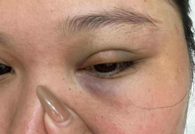 Thấy sự việc căng thẳng, chị Nhi đứng dậy can ngăn thì bị một thanh niên trong nhóm đó đấm thẳng vào mặt. “Cú đấm rất mạnh khiến tôi ngã xuống, choáng váng, mắt trái đau nhức dữ dội. Khi được đưa đi khám, bác sĩ kết luận tôi bị gãy xương hốc mắt trái kèm thoát vị mỡ ổ mắt vào xoang hàm dưới; sưng nề phần mềm quanh mắt trái”, chị Nhi cho hay.