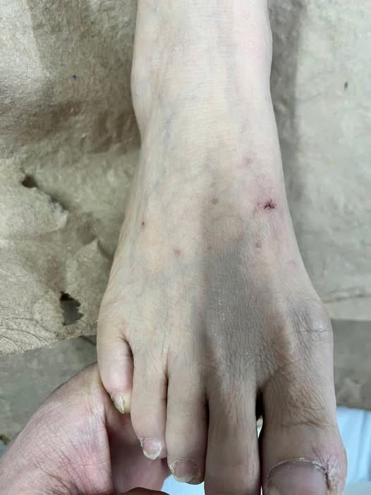 Khám tại bệnh viện, bác sĩ thấy mu chân phải có 2 vết cắn nông, kích thước 1–2mm, dấu răng mèo. Mặc dù miệng vết thương đã cầm máu nhưng có nguy cơ nhiễm trùng và nguy cơ bệnh dại.