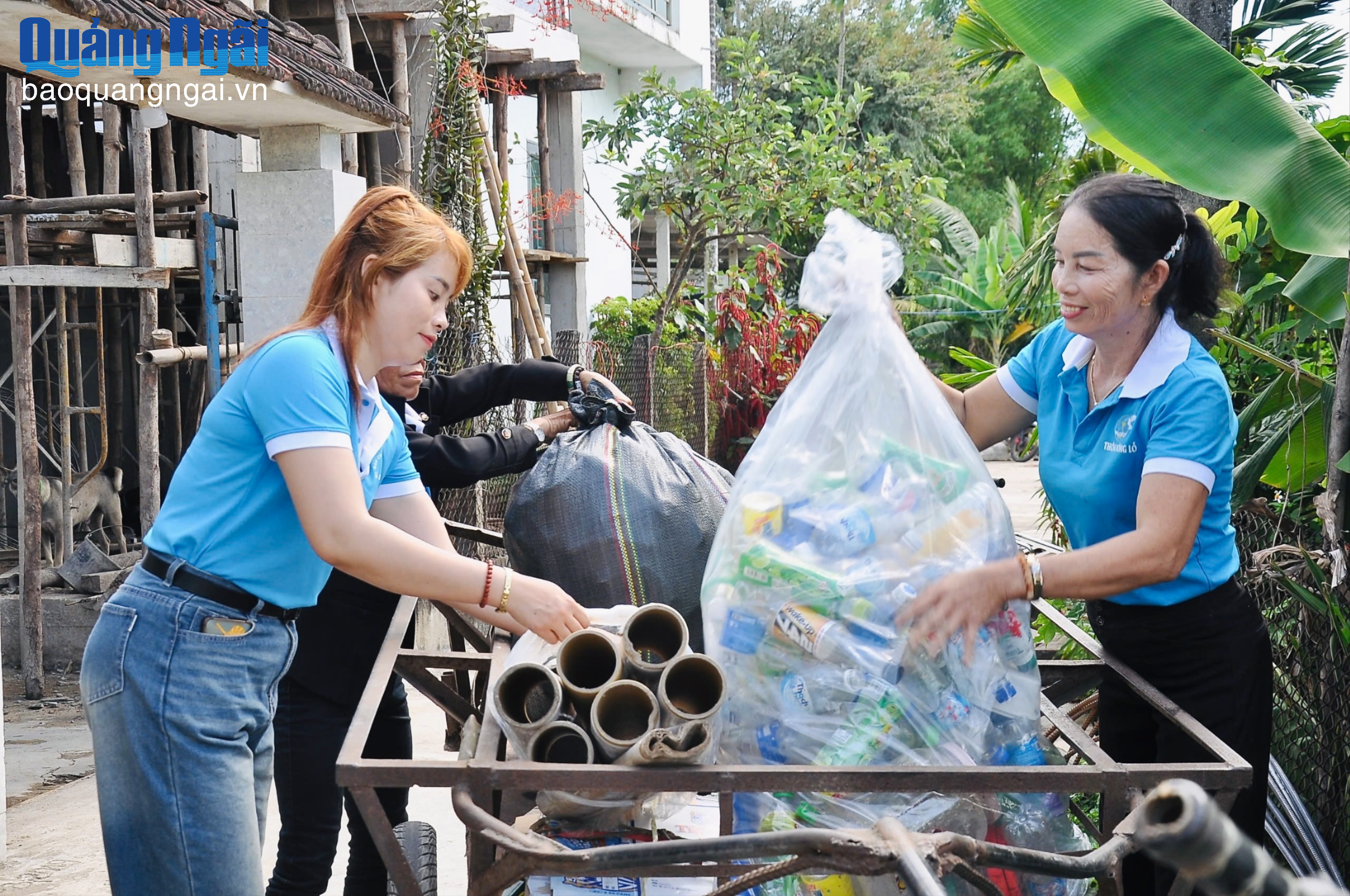 Phụ nữ thôn Đông Lỗ, xã Vạn Tường thu gom phế liệu gây quỹ giúp đỡ người nghèo. Ảnh: H.THU