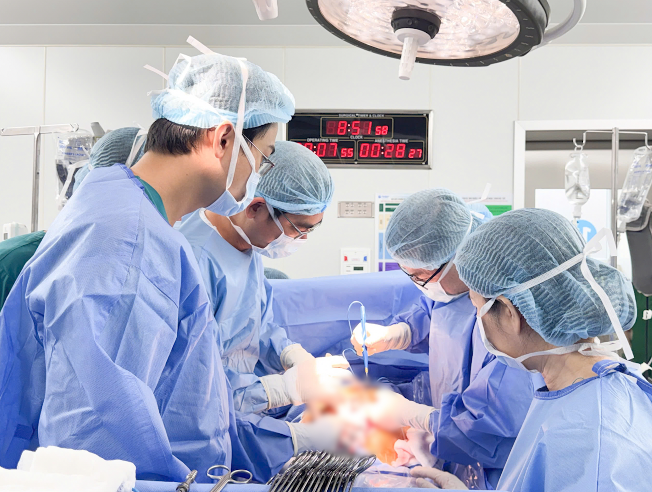 E-kip phẫu thuật đã lựa chọn đường mổ dọc để đảm bảo bộc lộ tối đa trường mổ, tạo điều kiện xử trí an toàn khối u kích thước lớn. Trong quá trình bóc tách khối u có hệ thống mạch máu tăng sinh phức tạp, các bác sĩ đã chủ động áp dụng kỹ thuật cầm máu bằng mũi may hình chữ nhật linh hoạt và hiệu quả.