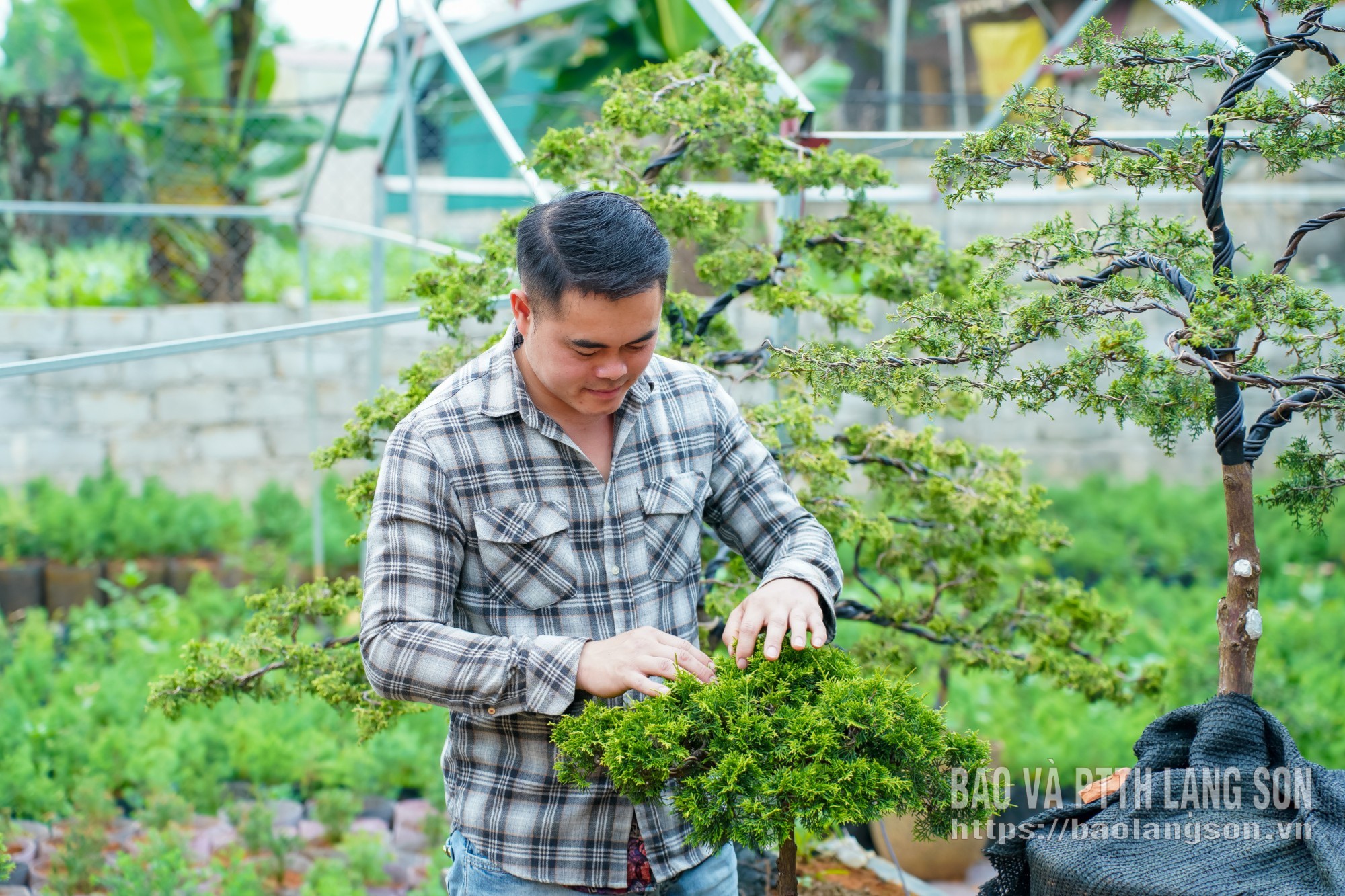 Anh Vũ Việt Nghĩa kiểm tra cây bonsai hoàng đàn
