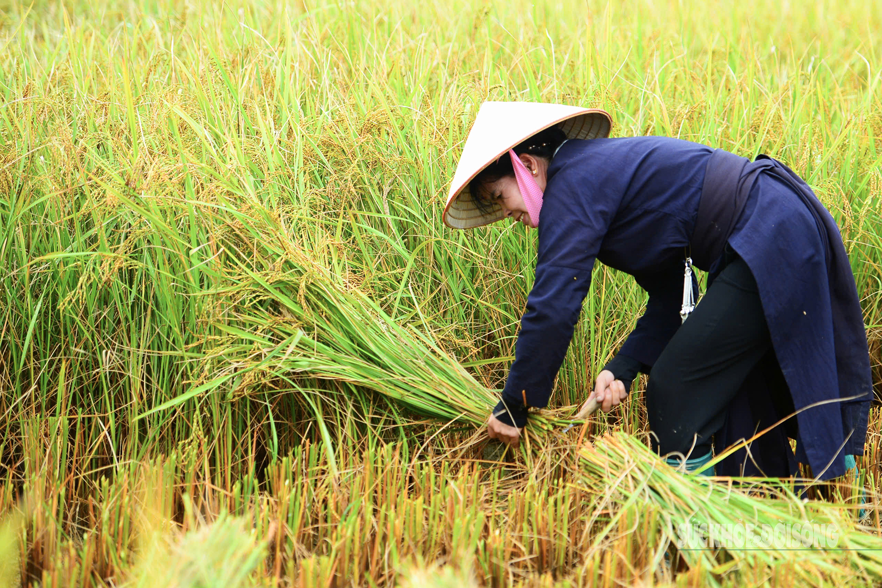 Phụ nữ Tày trong trang phục chàm khom mình cắt lúa – hình ảnh thân thuộc của mùa gặt xưa.