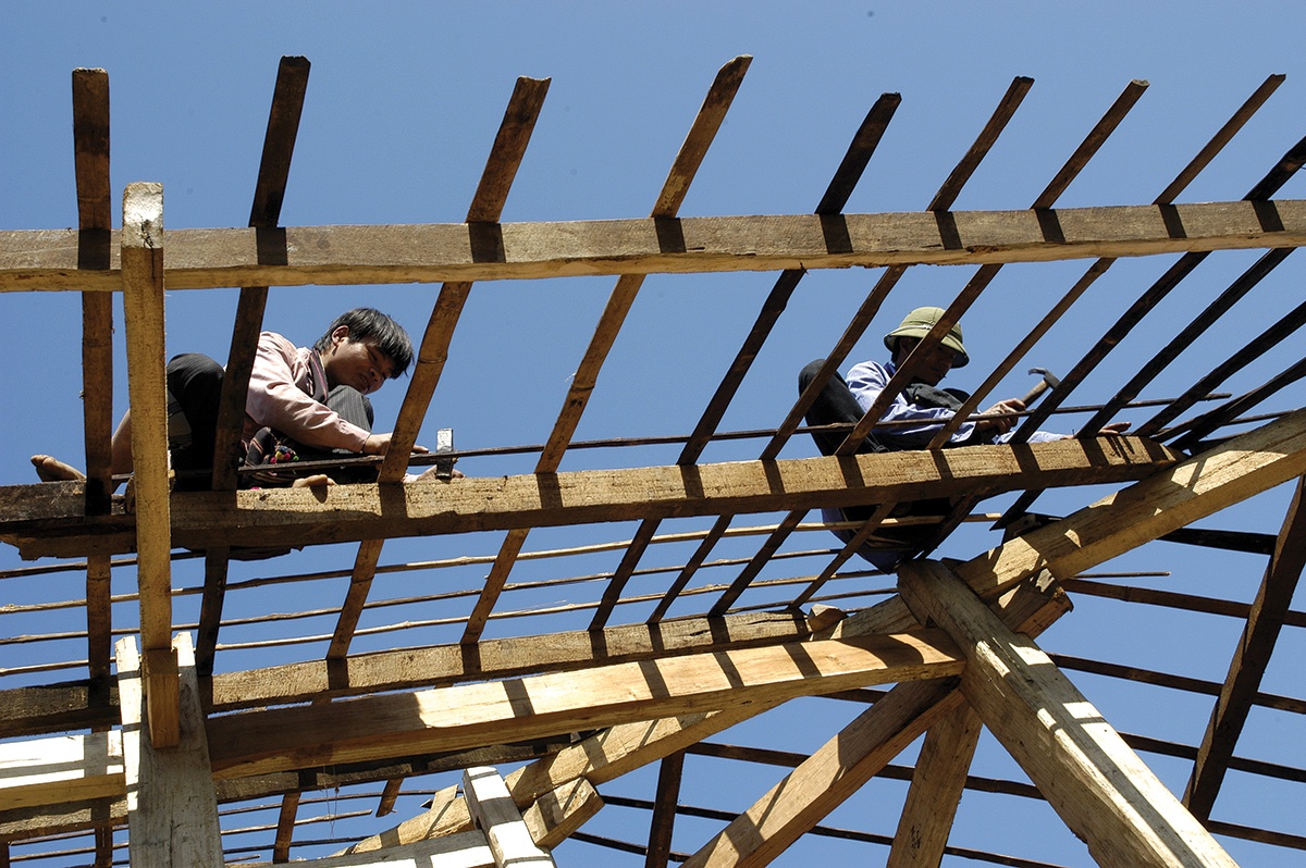 Dân bản chung sức đẩy một vì lên khung dựng nhà