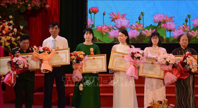 Phó Giáo sư, Tiến sĩ Nguyễn Thị Ái Nhung (mặc áo dài xanh, đứng giữa) nhận Bằng khen Thi đua yêu nước Thành phố Huế lần thứ VI (2025 - 2030). Ảnh: Văn Dũng/TTXVN