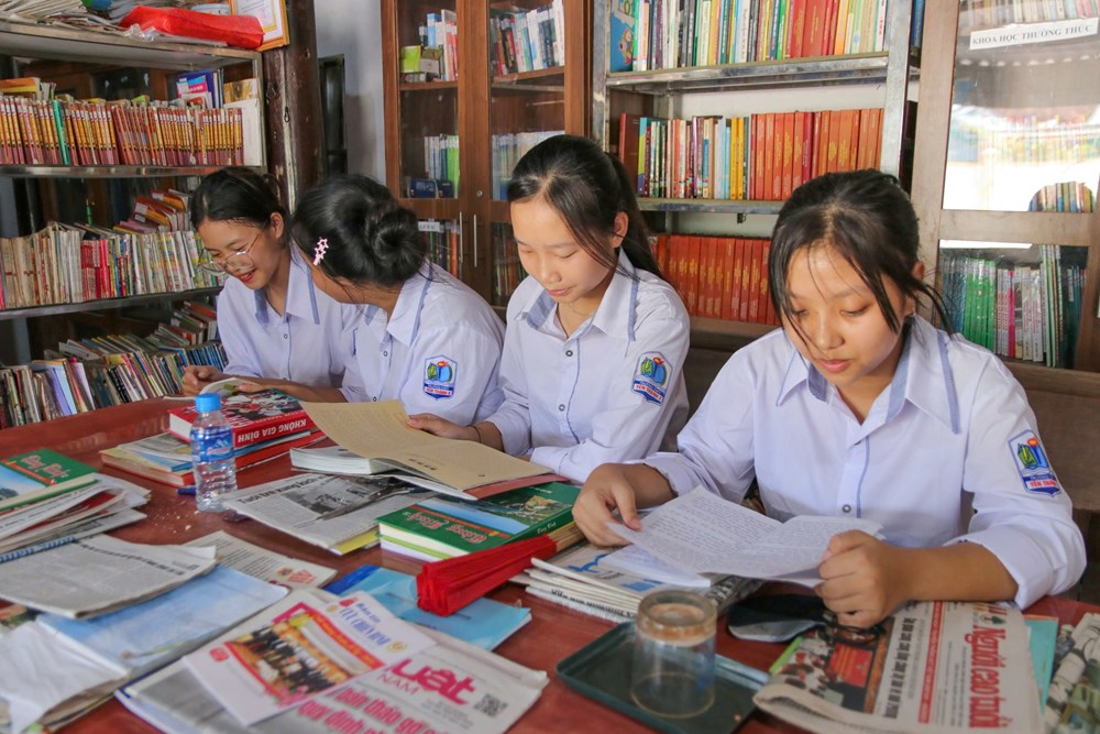 Học sinh thích thú với nhiều loại đầu sách trong thư viện