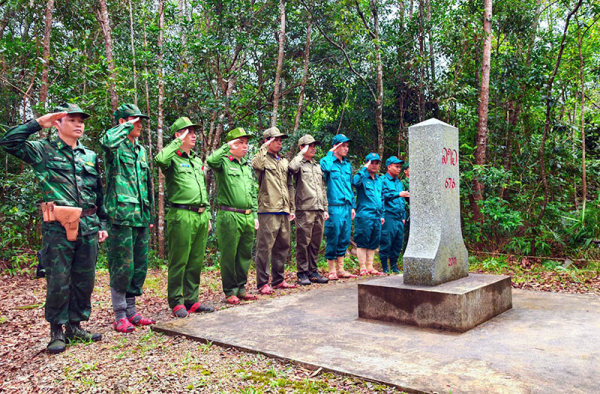 Rồi, những ngày mưa phùn lất phất, Đại úy Phạm Ngọc Thủy cùng Bộ đội Biên phòng tuần tra cột mốc 676-677. Trên đường công tác, anh và các lực lượng phát quang bụi rậm, dọn vệ sinh quanh mốc giới, rồi đứng nghiêm chào cờ Tổ quốc ngay trên đường biên. Gió núi thổi phần phật lá cờ đỏ sao vàng - khoảnh khắc khiến bất kỳ người chiến sĩ nào cũng thấy tim mình rung lên từng nhịp tự hào. Hay, khi có những đêm ngồi bên bếp lửa nhà Gươl, nghe già làng kể chuyện rẫy nương, chuyện giữ làng, Đại úy Phạm Ngọc Thủy càng hiểu thêm rằng: An ninh biên giới không chỉ là cột mốc bằng bê-tông, mà đó là lòng dân, là hơi ấm bếp lửa, là tiếng chiêng vang giữa đại ngàn.