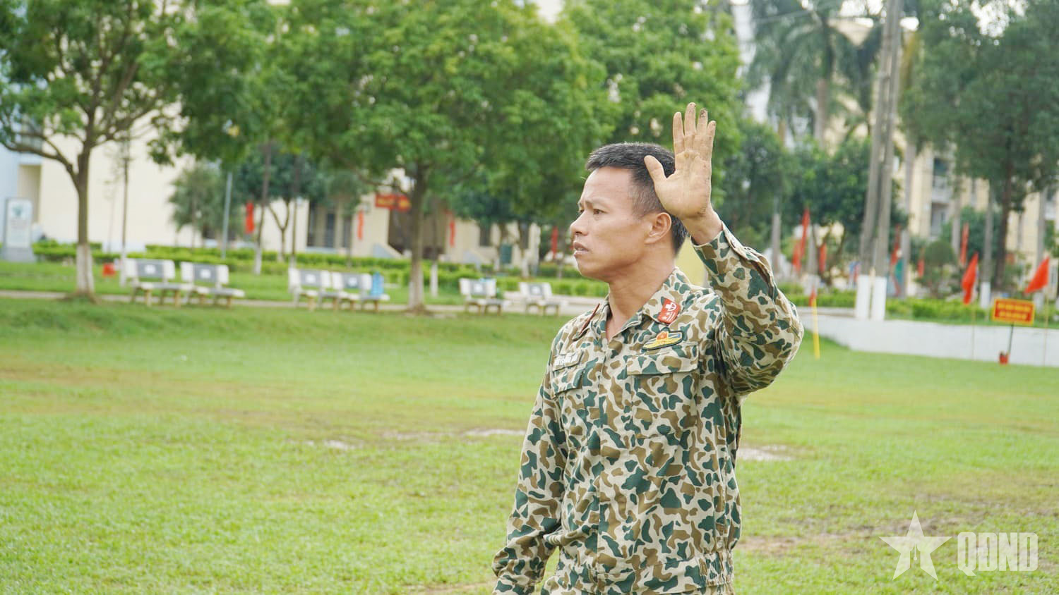 Trung tá Nguyễn Văn Duẩn trong quân phục dã chiến K17 (màu nhạt) thị phạm động tác cho học viên.
