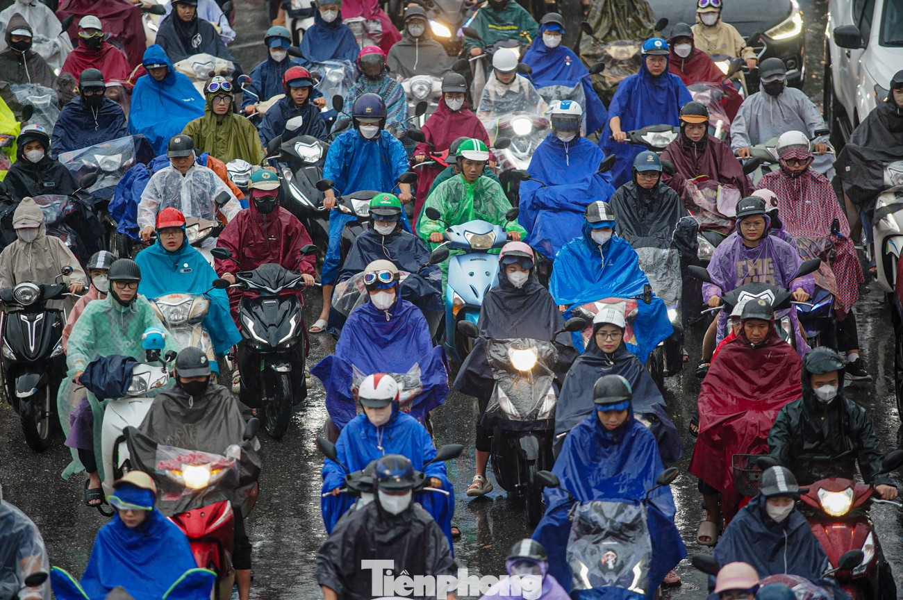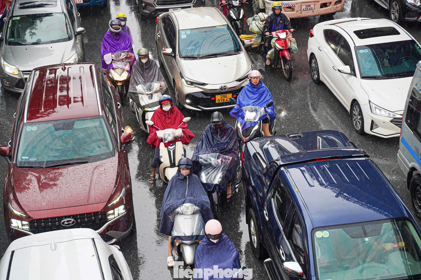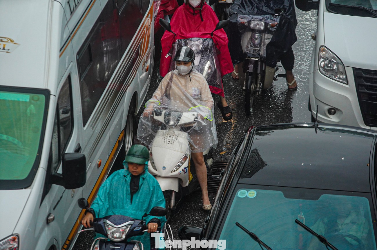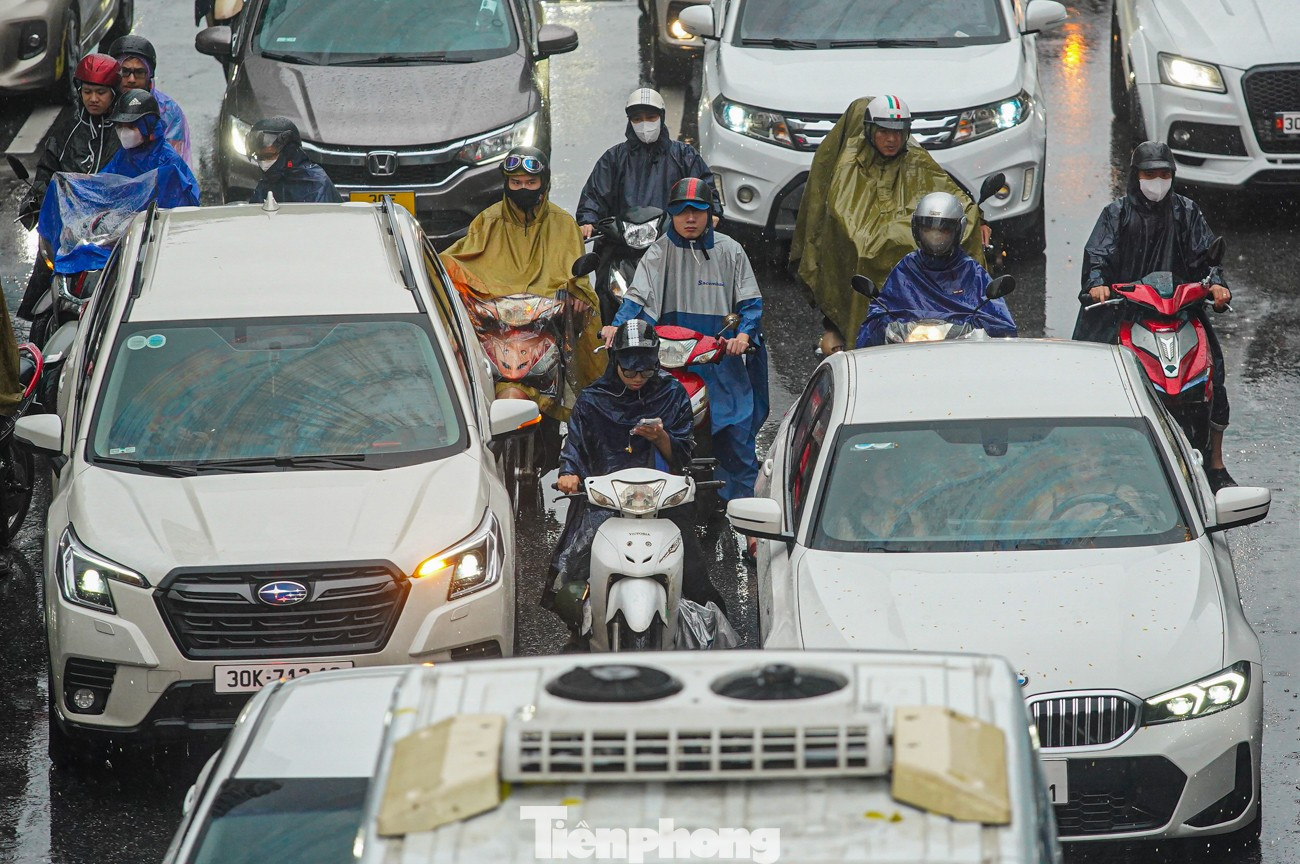 Người dân di chuyển chật vật trong cơn mưa lớn và tắc đường.