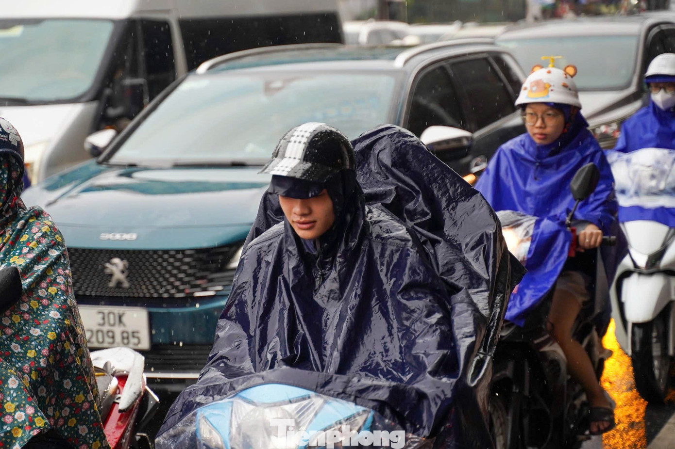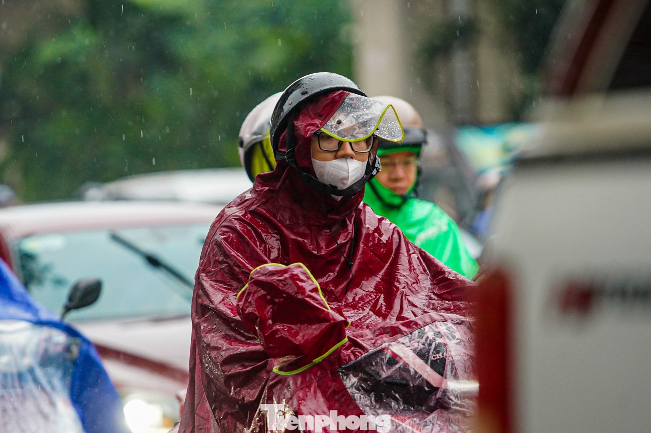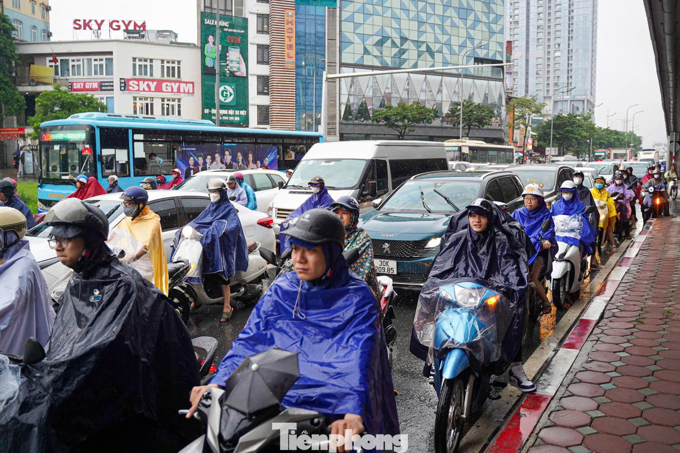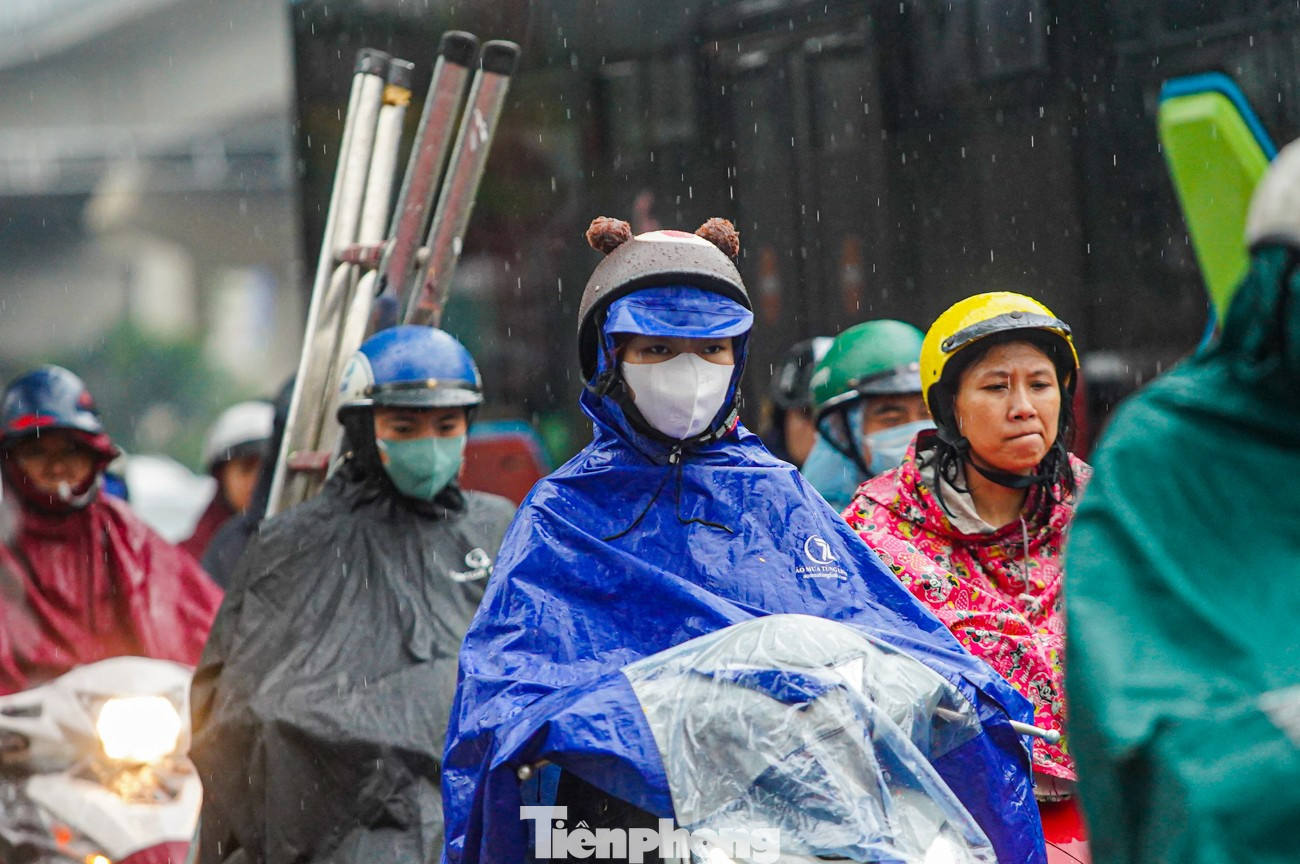 Người dân di chuyển chật vật trong cơn mưa lớn và tắc đường.