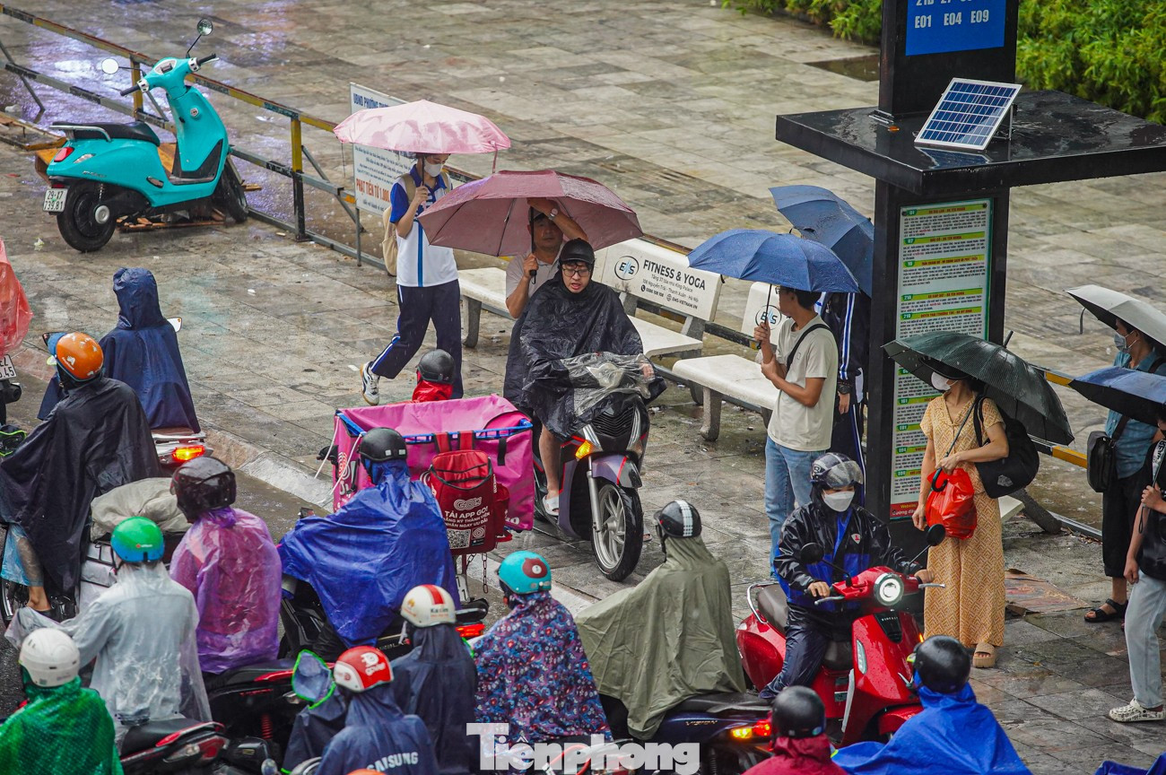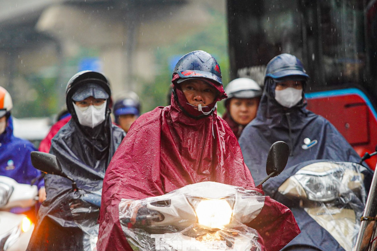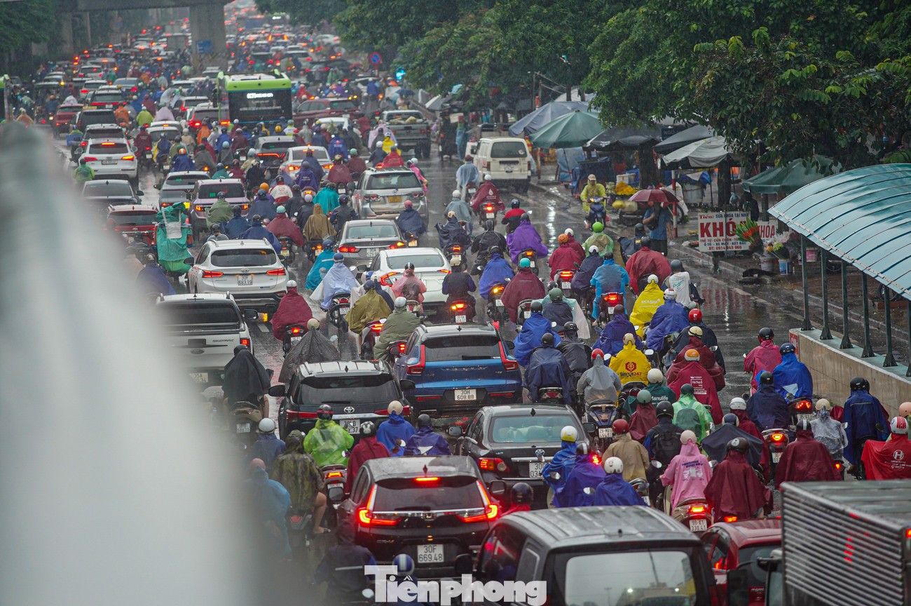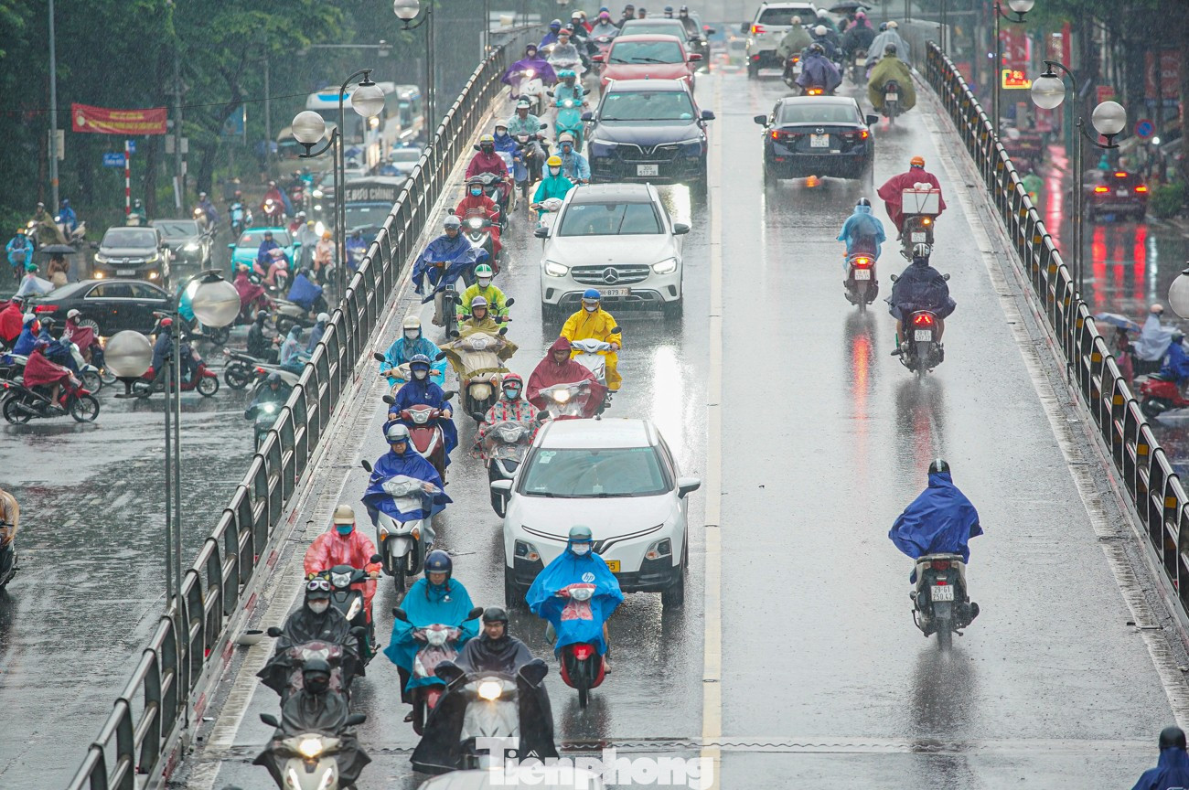 Người dân di chuyển chật vật trong cơn mưa lớn và tắc đường.