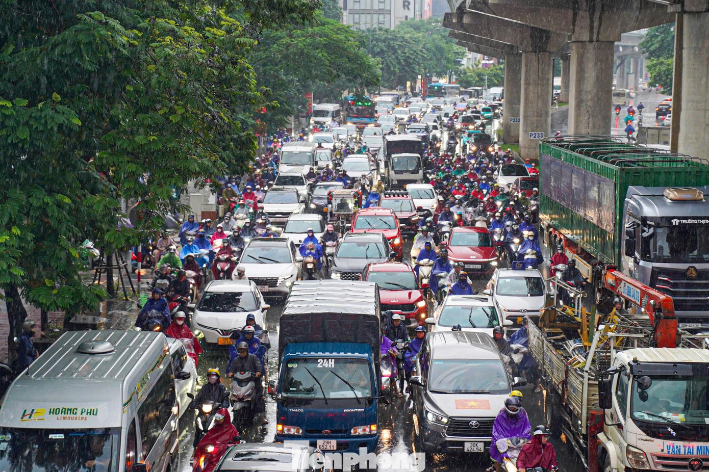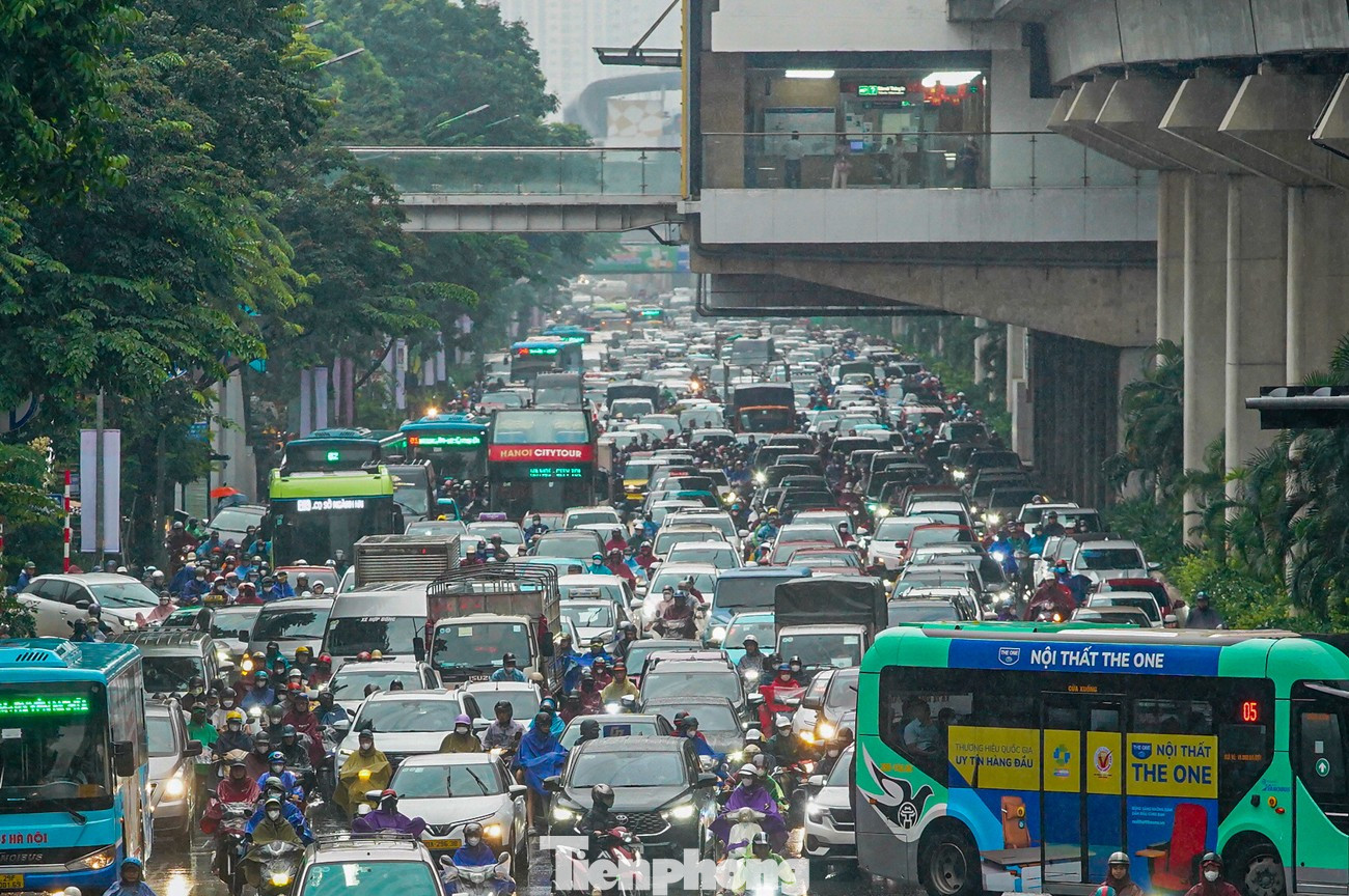 Dòng xe trên đường Láng gần như đứng im, chỉ nhích từng bước trong mưa.