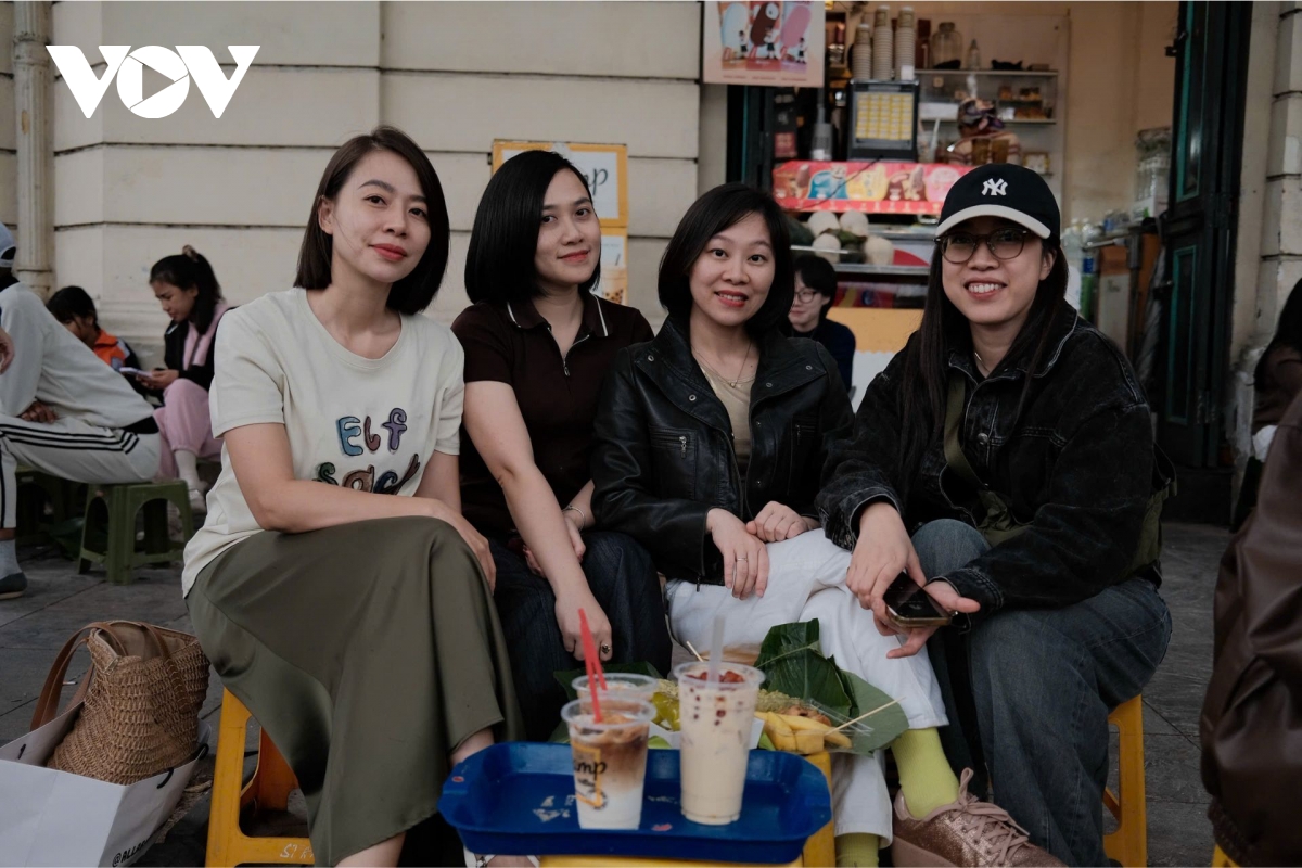 Các quán cà phê, trà chanh vỉa hè trở thành điểm đến lý tưởng của nhiều người dân Hà Nội. Chị Đào Nguyệt Minh (đội mũ, ngồi ngoài cùng bên phải) hào hứng chia sẻ: “Cảm giác thời tiết hôm nay khác hẳn hôm qua, lạnh và dễ chịu khiến tôi thấy rất yêu Hà Nội vào những ngày này. Sáng xem dự báo thấy có không khí lạnh, đúng dịp nhóm bạn tôi từ Quảng Ninh lên chơi, nên mọi người rủ nhau ra phố đón gió mùa đầu tiên và chụp vài bức ảnh kỷ niệm. Thời tiết như thế này thấy tâm trạng yêu đời, phấn khởi hẳn lên”.