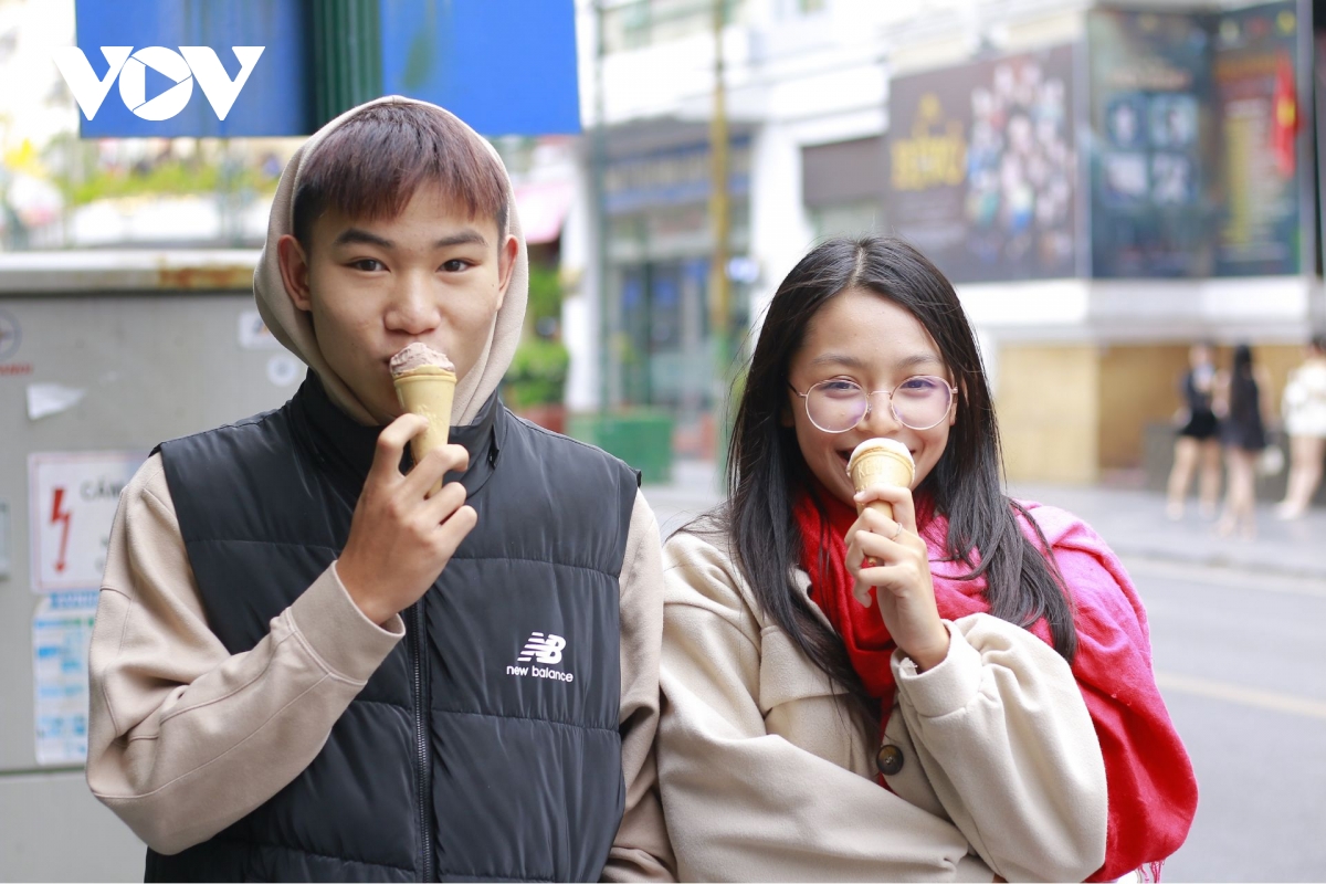 Trời trở lạnh nhưng những que kem mát lạnh vẫn là lựa chọn yêu thích của nhiều bạn trẻ, vừa thưởng thức vừa cười nói rộn ràng giữa phố.