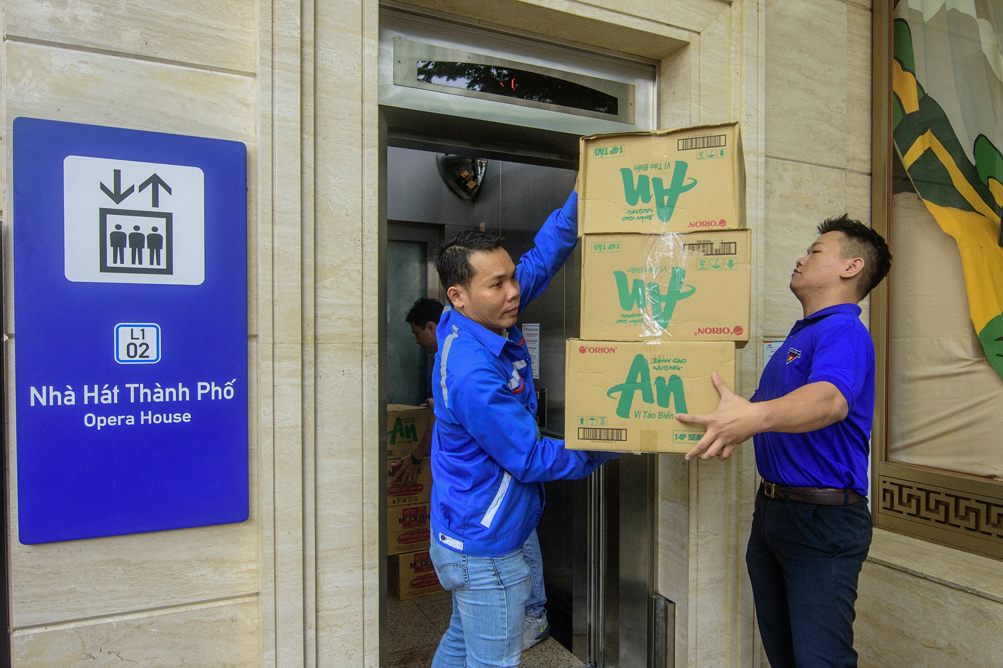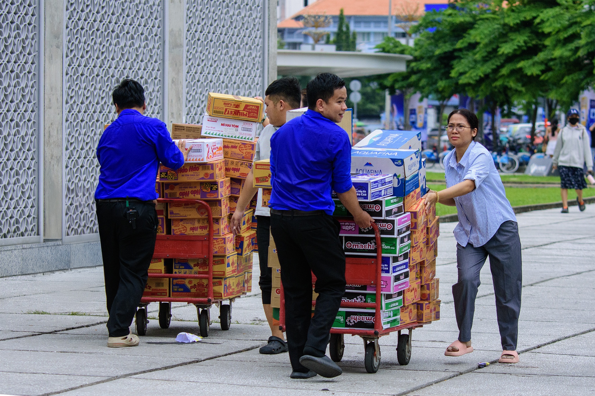 Hàng chục tình nguyện viên đã có mặt tại kho tập kết, di chuyển từng thùng mì một cách khẩn trương. Các nhóm nhanh chóng kiểm đếm, sắp xếp và dán nhãn từng thùng hàng, chuẩn bị để những chuyến xe cứu trợ kịp giờ xuất phát.