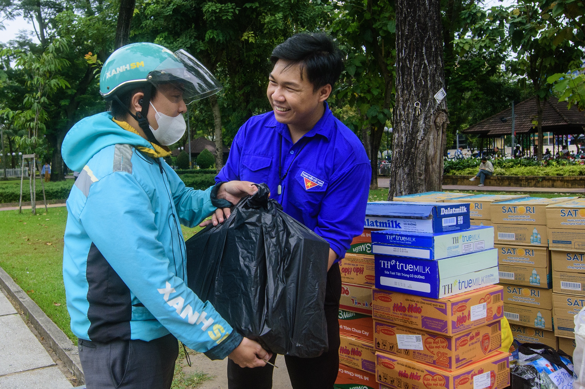 Một số người dân vừa mang thêm các túi đồ đến, nhanh chóng chuyển cho tình nguyện viên rồi rời đi để nhường chỗ cho lượt tiếp theo. Theo ghi nhận, lượng hàng vẫn tiếp tục tăng khi người dân đổ về từ nhiều khu vực lân cận.