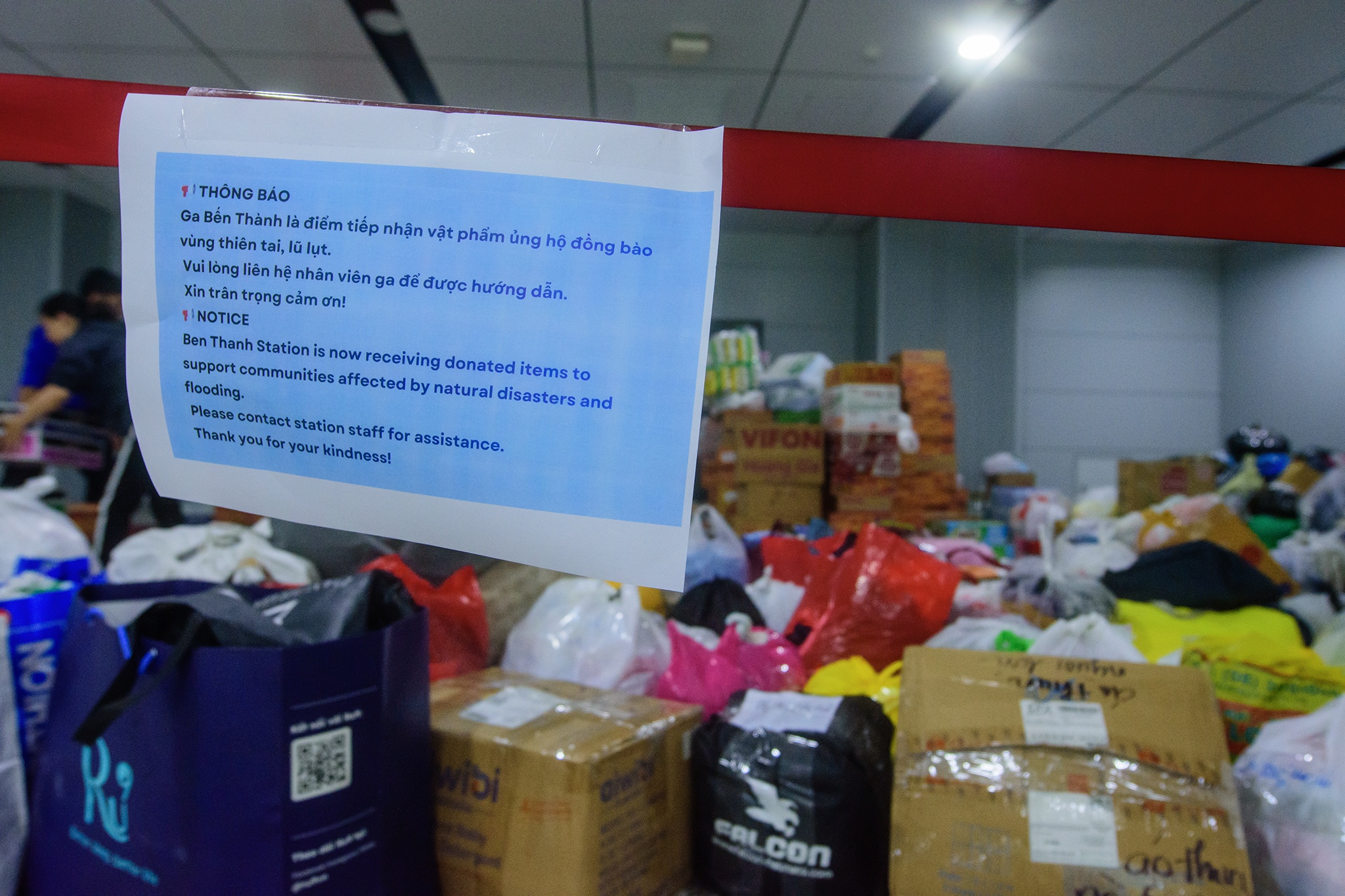Theo ghi nhận từ 7h30, tại Ga Bến Thành, rất đông người dân đã bắt đầu mang hàng cứu trợ đến. Từng thùng mì, gạo và các nhu yếu phẩm được cẩn thận đưa đến sảnh ga để phân loại chuẩn bị gửi về đồng bào miền Trung - Tây Nguyên đang oằn mình chịu lũ lịch sử.