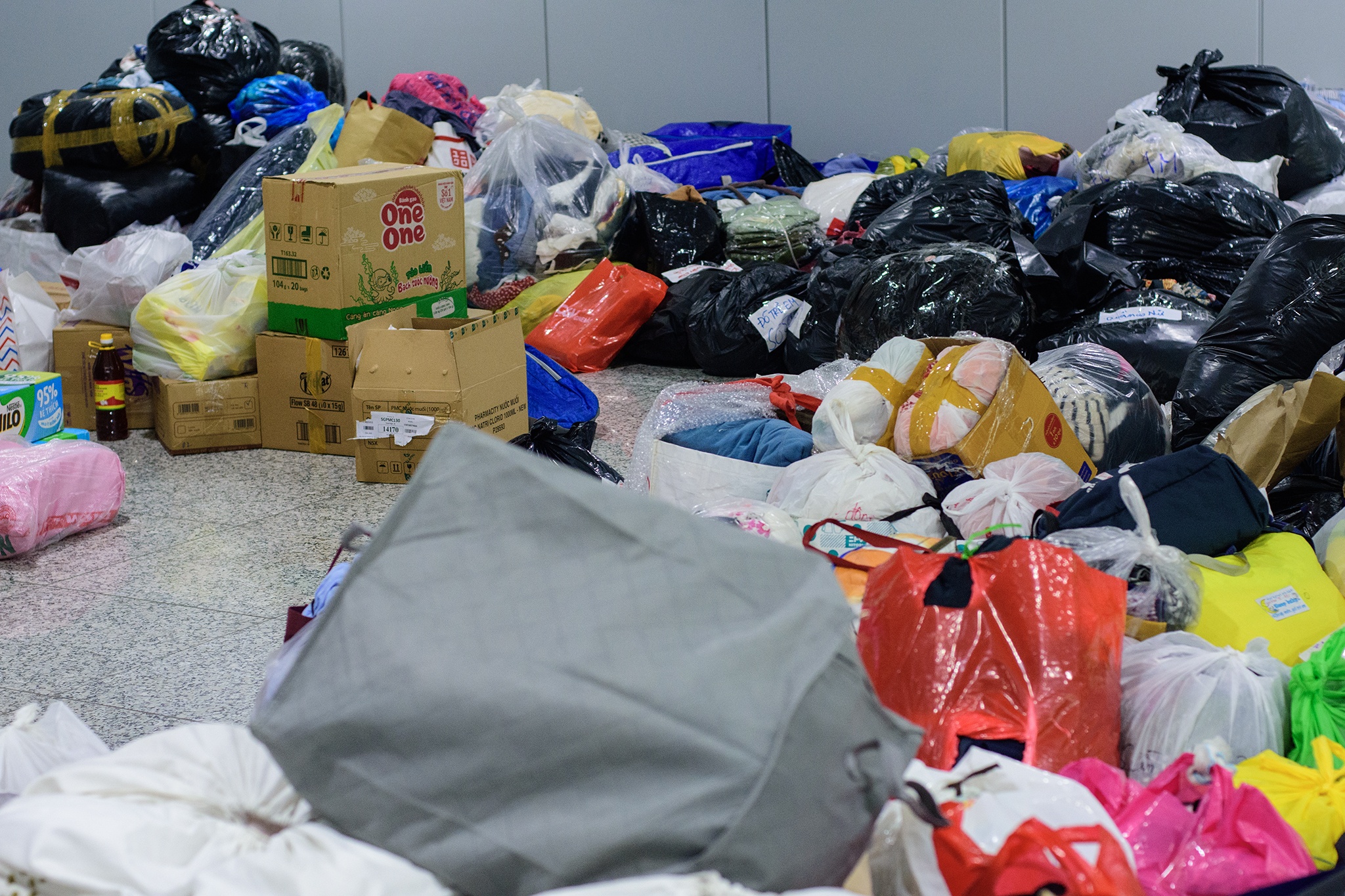 Hàng cứu trợ được phân loại thành từng nhóm thực phẩm, quần áo, đồ dùng trẻ em, chăn… mỗi thùng hàng đều được đóng gói cẩn thận.