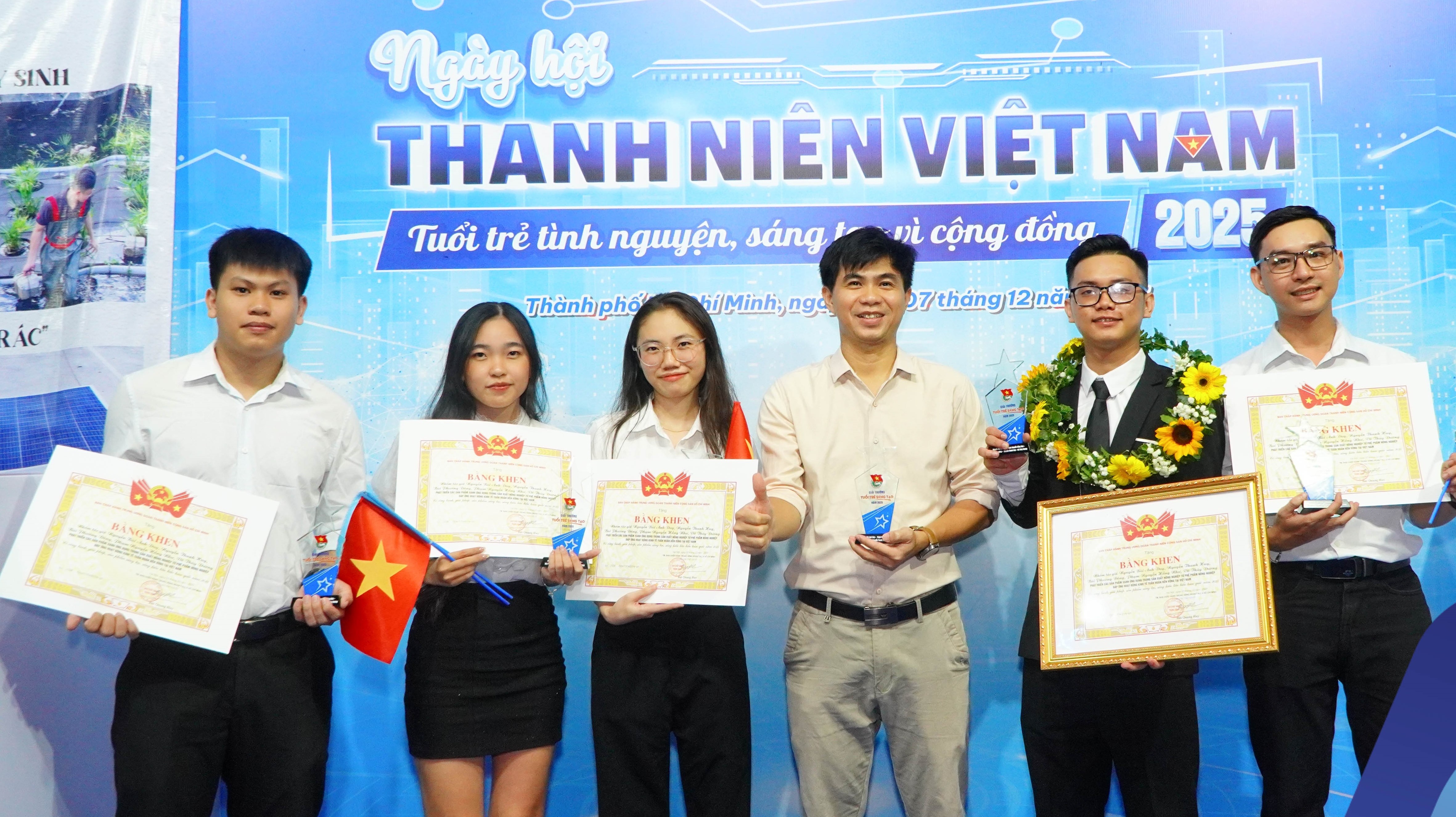 Duy cùng nhóm nghiên cứu sản phẩm xanh từ phế phẩm nông nghiệp được Trung ương Đoàn trao giải thưởng Tuổi trẻ sáng tạo toàn quốc năm 2025