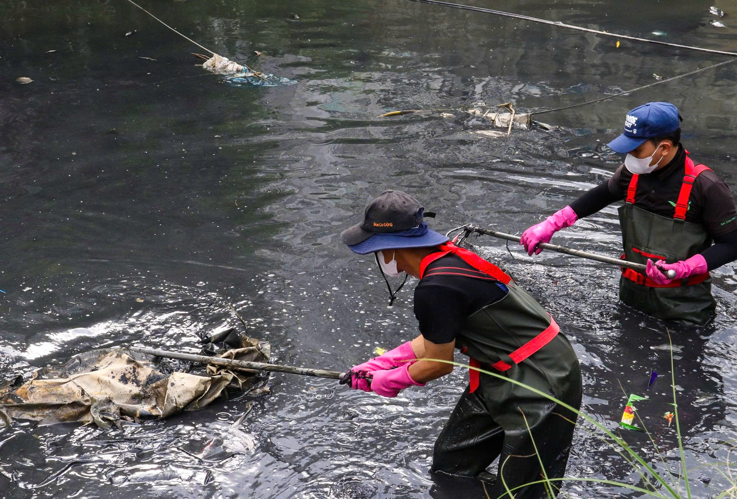 Khoác lên mình bộ đồ bảo hộ, găng tay và khẩu trang, họ lội xuống dòng nước đen, ngâm mình trong bùn để vớt rác, khơi thông dòng chảy.