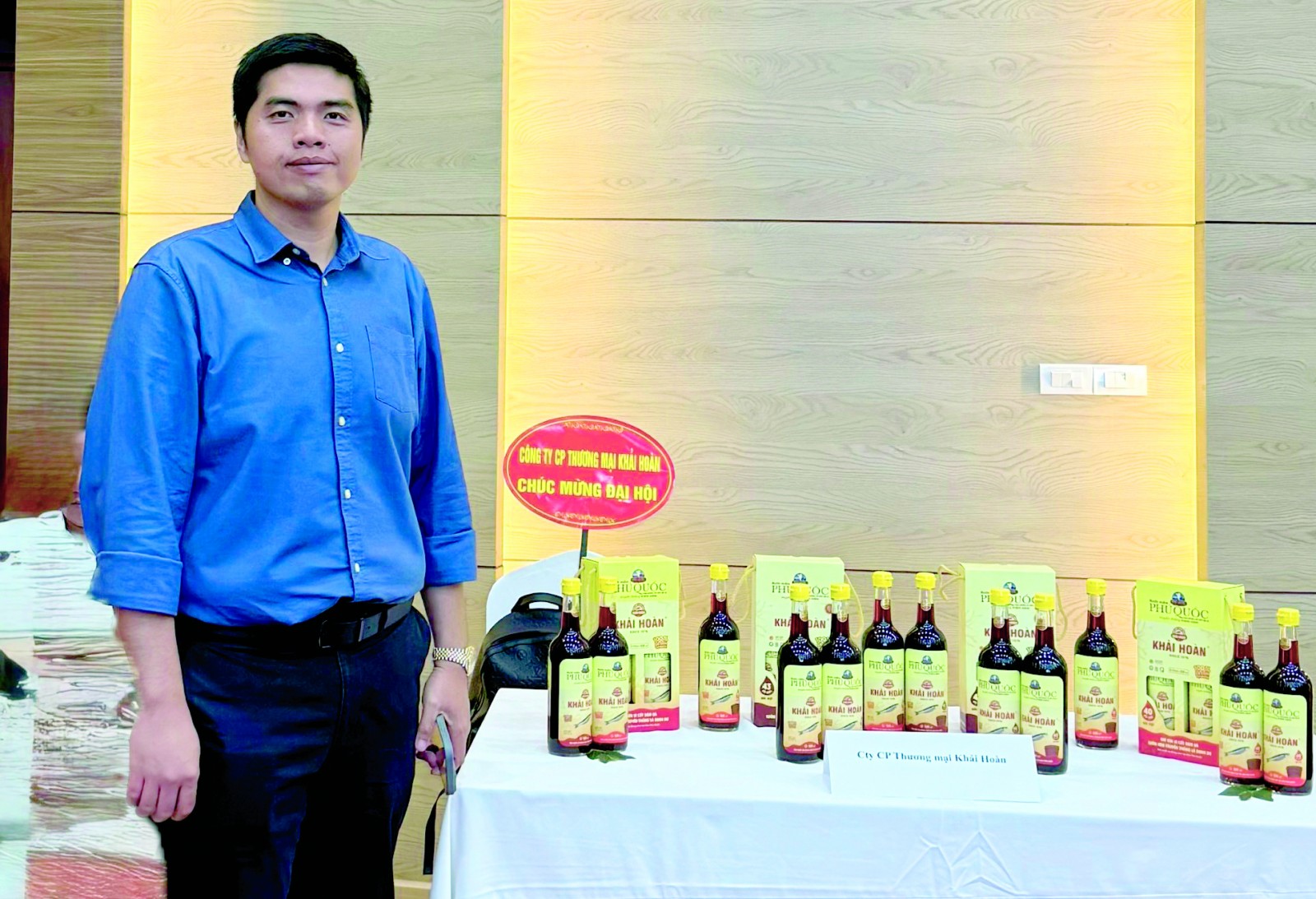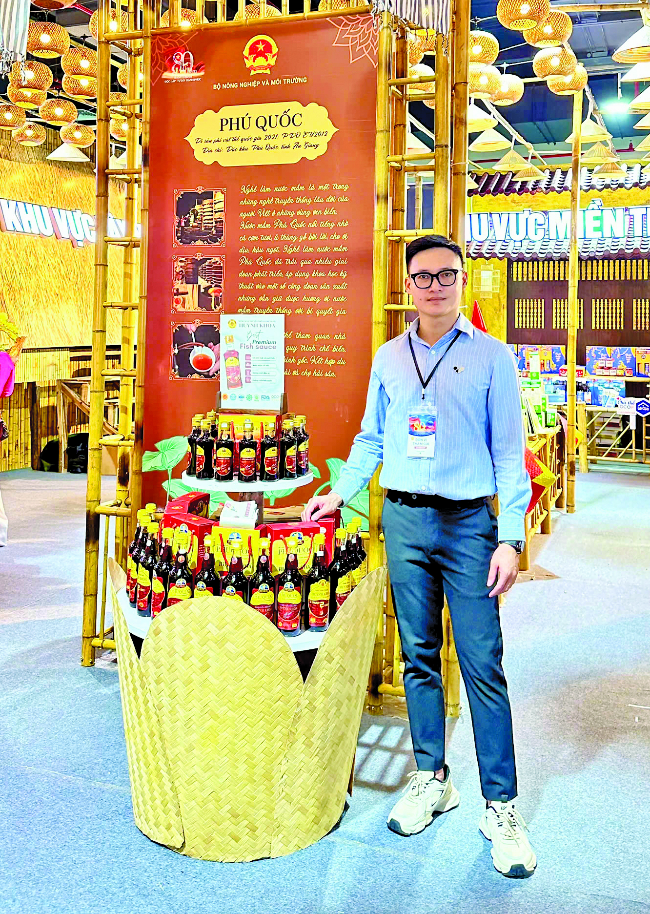 Anh Trần Bảo Quốc - người kế nghiệp Công ty Cổ phần Thương mại Khải Hoàn, đặc khu Phú Quốc bên sản phẩm nước mắm trưng bày tại các hội nghị.