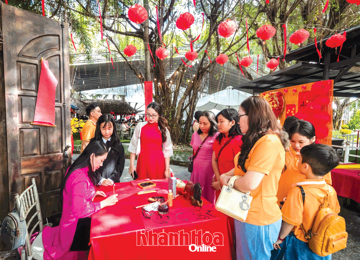 Tại Khu du lịch Champa Island Nha Trang (phường Bắc Nha Trang), chị Lê Thị Thanh Hòa (phường Nam Nha Trang) góp mặt ở gian hàng thư pháp, mang đến cho du khách những nét chữ đầu xuân ý nghĩa. Đến với nghệ thuật thư pháp từ niềm yêu thích cá nhân, 5 năm trở lại đây, ngoài công việc chuyên môn là thiết kế nội thất, chị Lê Thị Thanh Hòa thường dành thời gian có mặt tại các điểm du lịch hay những không gian du xuân có đông người dân và du khách để viết thư pháp. Từ giấy dó, mực tàu đến từng nét bút đều được chị chăm chút với mong muốn góp phần gìn giữ và lan tỏa giá trị văn hóa truyền thống trong dịp Tết. “Công việc thiết kế nội thất giúp tôi nắm bắt được bố cục, đường nét nên dễ dàng tiếp cận với nghệ thuật thư pháp. Những ngày lễ, Tết được ngồi viết chữ cho người xin chữ, tôi rất thích thú và cảm thấy mình đang làm một việc ý nghĩa”, chị Hòa cho hay.