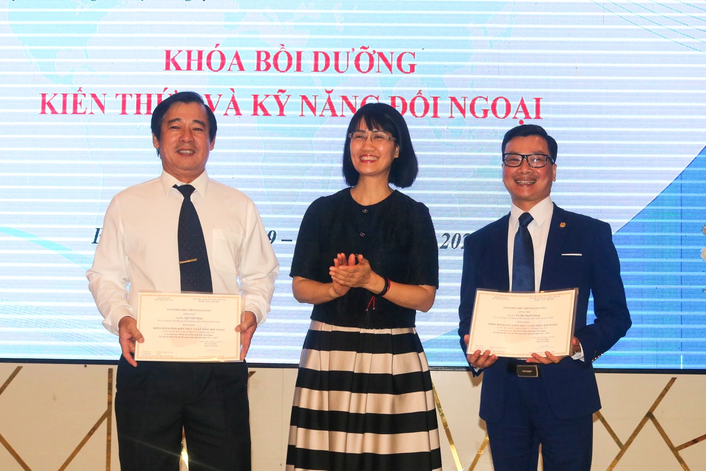 Tiến sĩ Lương Thanh Sơn, Chủ tịch Liên hiệp các Hội KH & KT Lâm Đồng (bên trái) được Học viện Ngoại giao trao giấy chứng nhận