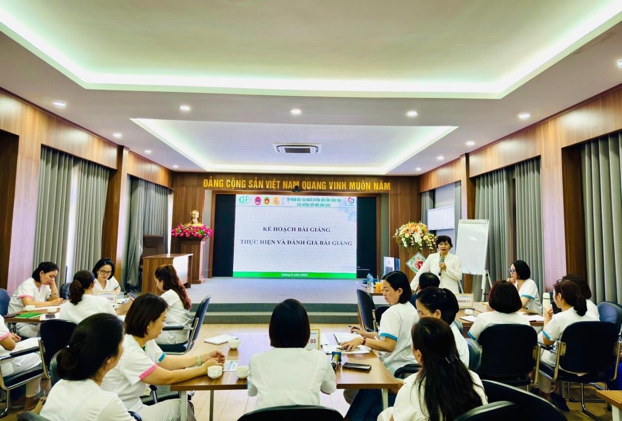 Bà Khúc Thị Hồng Anh giảng dạy phương pháp sư phạm lâm sàng cho điều dưỡng trưởng các khoa lâm sàng Bệnh viện Thanh Nhàn. Ảnh: BVTN