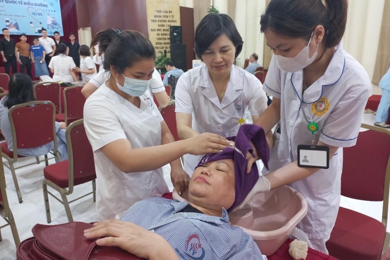 Bà Khúc Thị Hồng Anh (áo trắng, giữa) hướng dẫn tình nguyện viên gội đầu cho người bệnh tại Bệnh viện Đống Đa nhân Ngày điều dưỡng quốc tế 12-5. Ảnh: BVĐĐ