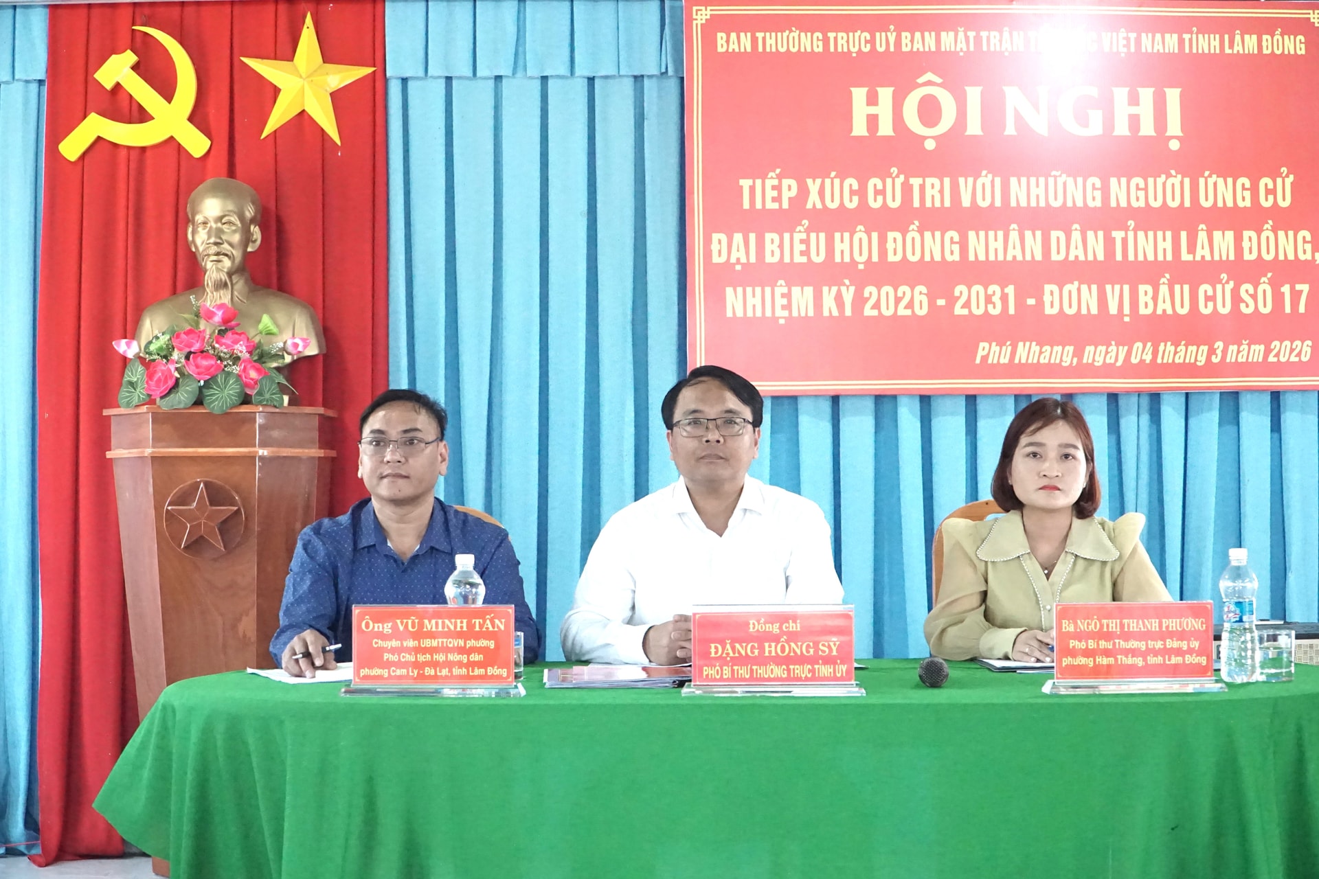 Tại Hội nghị, Ban Tổ chức đã công bố danh sách và tóm tắt tiểu sử 3 ứng cử viên đại biểu HĐND tỉnh nhiệm kỳ 2026 - 2031 thuộc Đơn vị bầu cử số 17, gồm các ông, bà: Đặng Hồng Sỹ, Phó Bí thư Thường trực Tỉnh ủy Lâm Đồng; Ngô Thị Thanh Phương, Phó Bí thư Thường trực Đảng ủy phường Hàm Thắng; Vũ Minh Tấn, Chuyên viên Ủy ban MTTQ Việt Nam phường, Phó Chủ tịch Hội Nông dân phường Cam Ly - Đà Lạt.