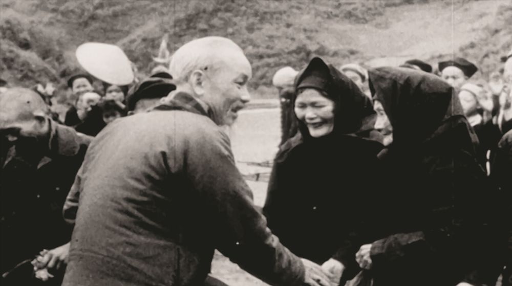 Bác Hồ bắt tay thăm hỏi các cụ già khi về thăm Pác Bó vào dịp Xuân Tân Sửu 1961.