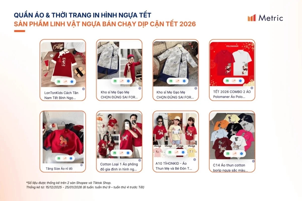 Các sản phẩm bán chạy tập trung ở phân khúc quà tặng và tiêu dùng nhanh như móc khóa, bao lì xì, ốp điện thoại, quần áo Tết in hình ngựa, áo dài, đồ trang trí, lịch, túi xách… Phần lớn sản phẩm có mức tiêu thụ cao ghi nhận trên TikTok Shop, phản ánh xu hướng mua sắm "bắt trend" và ưu tiên các vật phẩm mang tính biểu tượng, cầu may dịp đầu năm.