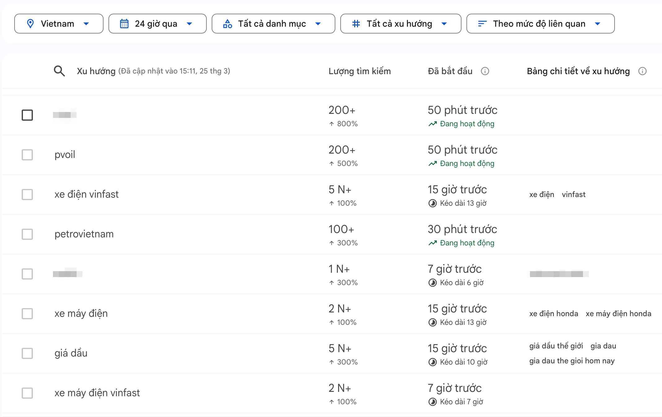 Theo thống kê từ Google Trends, trong 24 giờ qua, lượng tìm kiếm của người dùng Internet tại Việt Nam đổ về các từ khóa liên quan đến xe điện.