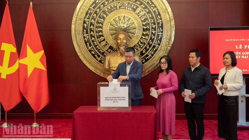 Cán bộ Đại sứ quán, đại diện cơ quan bên cạnh Đại sứ quán, khối báo chí tham gia quyên góp, ủng hộ.