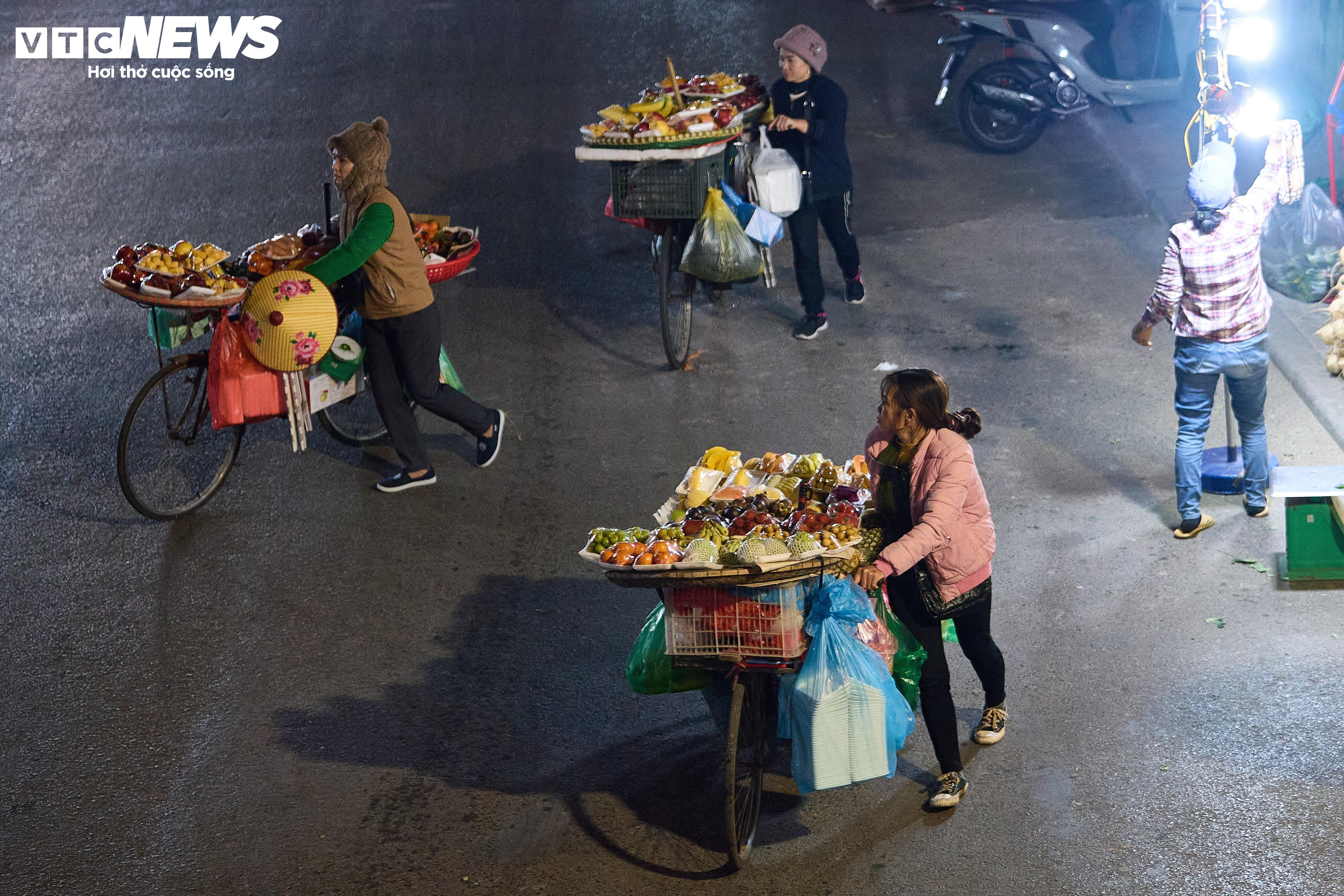 Ở một góc khác của thành phố, chợ đầu mối Long Biên vẫn sáng rực ánh đèn. Xe hàng nối đuôi nhau ra vào, tạo nên nhịp sống hối hả không ngơi nghỉ.